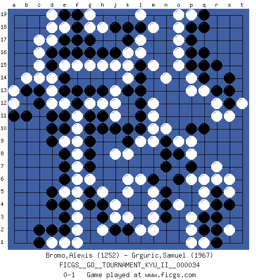 Last move : 0-1 2011 September 9 5:56:21 [Event "FICGS__GO__TOURNAMENT_KYU_II__000034"] [Site "FICGS"] [Date "2011.03.04"] [Round "1"] [Black "Bromo,Alexis"] [White "Grguric,Samuel"] [Result "0-1"] [Rating 1 "1252"] [Rating 2 "1967"] 1.q16 q4 2.d4 c15 3.d16 c16 4.d15 d14 5.e14 d13 6.e13 d17 7.e17 c17 8.q10 o17 9.p17 o16 10.p16 o15 11.p15 p14 12.q14 q13 13.k4 r14 14.q15 p13 15.r15 r12 16.s14 r7 17.d10 e15 18.e16 f15 19.f16 g15 20.g16 h15 21.h16 j15 22.j16 e12 23.f13 g12 24.f12 f11 25.g13 h12 26.h13 j13 27.e11 d12 28.g11 f10 29.g10 f9 30.e10 j11 31.g9 f8 32.e8 f7 33.e7 f6 34.e6 f4 35.e3 f3 36.e4 k6 37.l5 m4 38.n5 m5 39.m6 l6 40.l4 m3 41.l3 m2 42.n4 l2 43.k2 j3 44.h3 j4 45.h4 k5 46.j2 k3 47.h11 j12 48.j10 k14 49.g8 f5 50.g7 h5 51.g5 g6 52.g4 h2 53.k10 k16 54.k17 l17 55.l18 l16 56.j18 j8 57.h10 l9 58.l10 m10 59.k9 k8 60.r13 r11 61.s12 s11 62.d11 m9 63.l11 m11 64.l12 m12 65.l13 n14 66.l14 m15 67.c12 c14 68.c13 o18 69.p18 e18 70.f18 d18 71.e19 p19 72.q19 o19 73.q18 t12 74.s13 b14 75.b13 a13 76.b11 f2 77.e2 e1 78.d2 a12 79.a11 d1 80.c1 e5 81.d5 e9 82.d9 m18 83.l15 k15 84.k13 l19 85.k18 f1 86.c2 d19 87.f19 g18 88.g17 g19 89.f17 h18 90.r4 q5 91.r5 r6 92.q3 p3 93.q2 p2 94.n7 p6 95.o6 p8 96.p7 q6 97.o8 p9 98.p10 o9 99.n9 n10 100.n8 o4 101.n3 s2 102.r3 q1 103.r1 p1 104.r2 s5 105.s4 s6 0-1 Here are the names of the openings (joseki) played in the four corners : Corner d16 : c15 d16 Mokuhazushi (Waemok, Wai`mu`) 5-3 Point. The mokuhazushi (5-3) point was popular in the Edo period in Japan (1600 - 1867). It emphasizes influence; territorially, it is inferior to the 3-4 point. Corner q16 : q16 o17 Hoshi (Hwajeom, Seongjeom, Xingwei`) 4-4 Point. The star or hoshi (4-4) point, emphasizing influence at the potential expense of territory. Ikken Kakari (Hankan Keolch'im, Yi Gua`jiao~, 1-Space Low Approach). White 2 is the standard approach move to the 4-4. Corner d4 : d4 f9 Hoshi (Hwajeom, Seongjeom, Xingwei`) 4-4 Point. The star or hoshi (4-4) point, emphasizing influence at the potential expense of territory. Player White won this Go (weiqi, baduk) game. Follow this game move after move (download)One point in the center is worth ten in the corner. (Anonymous) Now be brave and don't look back. Don't look back. (Shmi Skywalker in Star Wars ep.1)