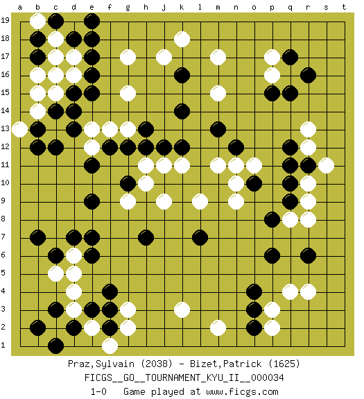 Last move : 1-0 2011 July 18 16:50:55 [Event "FICGS__GO__TOURNAMENT_KYU_II__000034 "] [Site "FICGS"] [Date "2011.03.04"] [Round "1"] [Black "Praz,Sylvain "] [White "Bizet,Patrick "] [Result "1-0"] [Rating 1 "2038"] [Rating 2 "1625"] 1.r16 c16 2.e17 g17 3.d15 d16 4.e16 c15 5.e15 d4 6.c14 d17 7.d18 c18 8.e18 b14 9.b13 c13 10.d14 b15 11.c12 g15 12.k16 g13 13.f12 q4 14.r6 r9 15.p6 r12 16.o4 p3 17.o3 r4 18.q10 r10 19.q12 r13 20.r11 s11 21.q11 p17 22.q15 m17 23.q17 p16 24.p15 m15 25.k14 k18 26.g12 j17 27.c6 d6 28.d7 c5 29.e6 d5 30.e7 g9 31.q9 r8 32.h13 f13 33.e9 j9 34.h7 l9 35.l7 k11 36.k12 j11 37.j12 m11 38.f4 h11 39.h12 g3 40.f3 g2 41.f2 k3 42.c3 d3 43.d2 c2 44.b2 e2 45.c1 f1 46.e3 m2 47.o2 p2 48.b7 q8 49.p8 a13 50.b12 e13 51.d13 e12 52.e11 n9 53.g10 h10 54.m13 o11 55.o10 n10 56.n12 n11 57.c19 b19 58.b18 d19 59.b17 c17 60.e19 b16 61.c19 1-0 Here are the names of the openings (joseki) played in the four corners : Corner d16 : c16 e17Komoku (Somok, Xiao~mu`) 3-4 Point. The komoku (3-4) point is the traditional corner enclosure move..Ikken Kakari (Hankan Keolch'im, Yi Gua`jiao~, 1-Space Low Pincer). The small knight move is the basic approach move to the 3-4 point stone. It has been continually used for over four centuries. There are limitless variations, with new moves constantly being discovered. Black 2 opens the door to a treaure store of joseki. Corner q4 : q4 r6Hoshi (Hwajeom, Seongjeom, Xingwei`) 4-4 Point. The star or hoshi (4-4) point, emphasizing influence at the potential expense of territory.Ikken Kakari (Hankan Keolch'im, Yi Gua`jiao~, 1-Space Low Approach). Black 2 is the standard approach move to the 4-4. Corner q16 : r16 r12Komoku (Somok, Xiao~mu`) 3-4 Point. The komoku (3-4) point is the traditional corner enclosure move.. Corner d4 : d4 c6Hoshi (Hwajeom, Seongjeom, Xingwei`) 4-4 Point. The star or hoshi (4-4) point, emphasizing influence at the potential expense of territory.Ikken Kakari (Hankan Keolch'im, Yi Gua`jiao~, 1-Space Low Approach). Black 2 is the standard approach move to the 4-4. Player Black won this Go (weiqi, baduk) game.Follow this game move after move (download ) Every move brings change. (Pierre Audouard) I live to kill Traxler counterattack. (Ilmars Cirulis)