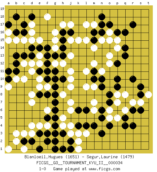 Last move : 1-0 2011 September 11 22:20:44 [Event "FICGS__GO__TOURNAMENT_KYU_II__000034"] [Site "FICGS"] [Date "2011.03.04"] [Round "1"] [Black "Blanloeil,Hugues"] [White "Segur,Laurine"] [Result "1-0"] [Rating 1 "1651"] [Rating 2 "1479"] 1.q16 d4 2.q4 d16 3.f3 j4 4.f5 d7 5.d2 b3 6.h3 j3 7.n3 h5 8.g5 h2 9.g2 h4 10.g3 e4 11.g7 j7 12.j2 k2 13.h1 h17 14.r10 d11 15.l4 l3 16.m4 f6 17.g6 e9 18.c17 c15 19.d18 f18 20.b16 b15 21.b18 a16 22.a17 a15 23.c16 d17 24.d13 e15 25.d14 d15 26.f13 g15 27.h13 k15 28.n17 m17 29.n16 l15 30.g10 j9 31.f8 j11 32.h10 g12 33.f12 f11 34.f10 e10 35.g11 h12 36.e11 e12 37.f11 d12 38.f14 j13 39.h14 g14 40.g13 e13 41.e14 f9 42.g9 h8 43.g8 f4 44.g4 k1 45.j1 f1 46.g1 e2 47.e3 d3 48.c2 c3 49.e8 d8 50.c13 j10 51.b11 c12 52.b12 c10 53.b13 b10 54.p10 o13 55.q13 p14 56.q14 n15 57.m16 l17 58.h15 g16 59.j16 j15 60.h16 j17 61.r4 n11 62.n9 m7 63.o7 l9 64.n6 m6 65.m10 l11 66.r17 p15 67.p16 o16 68.o17 o15 69.p12 o12 70.m11 m12 71.k4 k3 72.k6 j6 73.l6 m9 74.n10 r7 75.s6 p7 76.o8 p5 77.o4 o5 78.n5 o6 79.q5 q6 80.s8 s7 81.r6 t8 82.s9 p8 83.p9 q8 84.a10 a9 85.a11 b2 86.f2 c1 87.e1 a1 88.m15 m14 89.n18 1-0 This go game has been lost on time (started : 2011.03.04 20:30:37) Here are the names of the openings (joseki) played in the four corners : Corner d4 : d4 f3 Hoshi (Hwajeom, Seongjeom, Xingwei`) 4-4 Point. The star or hoshi (4-4) point, emphasizing influence at the potential expense of territory. Ikken Kakari (Hankan Keolch'im, Yi Gua`jiao~, 1-Space Low Approach). Black 2 is the standard approach move to the 4-4. Player Black won this Go (weiqi, baduk) game. Follow this game move after move (download)Each step in a ladder is worth 7 points. (Anonymous) The production of too many useful things results in too many useless people. (Karl Marx)