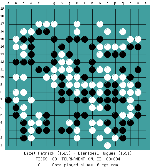 Last move : 0-1 2011 June 7 14:31:14 [Event "FICGS__GO__TOURNAMENT_KYU_II__000034"] [Site "FICGS"] [Date "2011.03.04"] [Round "1"] [Black "Bizet,Patrick"] [White "Blanloeil,Hugues"] [Result "0-1"] [Rating 1 "1625"] [Rating 2 "1651"] 1.q3 q16 2.c4 d16 3.j3 k17 4.r10 c10 5.r14 p14 6.p13 q14 7.q13 r15 8.s14 s15 9.o13 o14 10.l10 r5 11.r4 q5 12.o4 r8 13.s9 s8 14.q7 q8 15.p7 r9 16.s11 q10 17.q11 p10 18.p8 o11 19.m12 n9 20.m8 n8 21.n7 m9 22.l8 l9 23.k9 o7 24.o6 m7 25.o8 k8 26.l7 k10 27.k7 j9 28.o9 n11 29.m11 o10 30.m14 n14 31.l15 n17 32.j15 k16 33.k15 g17 34.g15 n13 35.k11 j11 36.k12 j12 37.j13 h13 38.h14 e4 39.f3 d3 40.e3 d4 41.c3 d2 42.c2 c5 43.b5 c6 44.b6 b7 45.c7 d7 46.a7 b8 47.g13 h12 48.g12 g11 49.d13 c14 50.h7 j4 51.f4 e5 52.f5 k3 53.h3 m3 54.n3 m4 55.l5 p4 56.p3 m6 57.k5 n2 58.o2 n6 59.o7 n4 60.p5 o3 61.q4 p2 62.q2 o1 63.s5 r6 64.s6 r7 65.p9 q9 66.n15 o16 67.j8 k9 68.h10 j10 69.h9 h11 70.k4 k2 71.f16 f17 72.e16 e17 73.d15 c16 74.c15 b15 75.d14 c13 76.d12 f10 77.c12 b14 78.b12 b10 79.f11 g10 80.e11 g9 81.h8 c8 0-1 Here are the names of the openings (joseki) played in the four corners : Corner q16 : q16 r14 Hoshi (Hwajeom, Seongjeom, Xingwei`) 4-4 Point. The star or hoshi (4-4) point, emphasizing influence at the potential expense of territory. Ikken Kakari (Hankan Keolch'im, Yi Gua`jiao~, 1-Space Low Approach). Black 2 is the standard approach move to the 4-4. Corner q4 : q3 r5 Komoku (Somok, Xiao~mu`) 3-4 Point. The komoku (3-4) point is the traditional corner enclosure move.. Ikken Kakari (Hankan Keolch'im, Yi Gua`jiao~, 1-Space Low Pincer). The small knight move is the basic approach move to the 3-4 point stone. It has been continually used for over four centuries. There are limitless variations, with new moves constantly being discovered. White 2 opens the door to a treaure store of joseki. Corner d16 : d16 j15 Hoshi (Hwajeom, Seongjeom, Xingwei`) 4-4 Point. The star or hoshi (4-4) point, emphasizing influence at the potential expense of territory. Player White won this Go (weiqi, baduk) game. Follow this game move after move (download)Don't reduce your own liberties. (Bill Taylor) Every now and then a man's mind is stretched by a new idea and never shrinks back to its former dimensions. (Oliver Wendell Holmes, Sr.)