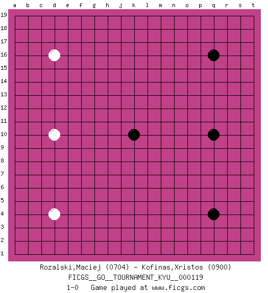 Last move : 1-0 2011 April 9 3:21:33 [Event "FICGS__GO__TOURNAMENT_KYU__000119"] [Site "FICGS"] [Date "2011.03.04"] [Round "1"] [Black "Rozalski,Maciej"] [White "Kofinas,Xristos"] [Result "1-0"] [Rating 1 "0704"] [Rating 2 "0900"] 1.q16 d16 2.q4 d4 3.q10 d10 4.k10 1-0 This go game has been lost on time (started : 2011.03.04 21:44:52) Here are the names of the openings (joseki) played in the four corners : Player Black won this Go (weiqi, baduk) game. Follow this game move after move (download)Dead group ? Always win ko fights ! (Anonymous) Nothing is more important for teaching us to understand the concepts we have than constructing fictitious ones. (Ludwig Wittgenstein)