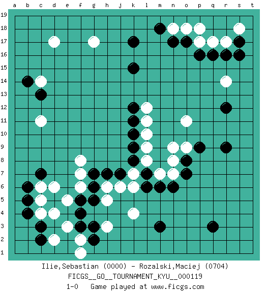 Last move : 1-0 2011 May 23 6:44:5 [Event "FICGS__GO__TOURNAMENT_KYU__000119"] [Site "FICGS"] [Date "2011.03.04"] [Round "1"] [Black "Ilie,Sebastian"] [White "Rozalski,Maciej"] [Result "1-0"] [Rating 1 "0000"] [Rating 2 "0704"] 1.q16 d4 2.q3 d17 3.r9 c11 4.f3 e3 5.f4 e5 6.c3 d2 7.c2 f2 8.g2 f1 9.b5 c4 10.b4 d6 11.c7 c6 12.b6 c5 13.f5 f6 14.g6 f7 15.k17 g17 16.k15 r14 17.r12 r17 18.r16 q17 19.p16 p17 20.o17 o18 21.n17 n18 22.m18 p18 23.s17 s18 24.s16 k4 25.m3 h3 26.g3 h5 27.g5 h6 28.g7 f8 29.h7 k6 30.j7 j6 31.m6 k7 32.k8 l8 33.k9 m7 34.n6 n7 35.l6 n9 36.l7 l9 37.k10 l10 38.o7 n8 39.o8 o9 40.p9 o11 41.k11 l11 42.k12 l12 43.c13 c14 44.b14 1-0 Here are the names of the openings (joseki) played in the four corners : Corner d4 : d4 f3 Hoshi (Hwajeom, Seongjeom, Xingwei`) 4-4 Point. The star or hoshi (4-4) point, emphasizing influence at the potential expense of territory. Ikken Kakari (Hankan Keolch'im, Yi Gua`jiao~, 1-Space Low Approach). Black 2 is the standard approach move to the 4-4. Corner q16 : q16 r14 Hoshi (Hwajeom, Seongjeom, Xingwei`) 4-4 Point. The star or hoshi (4-4) point, emphasizing influence at the potential expense of territory. Ikken Kakari (Hankan Keolch'im, Yi Gua`jiao~, 1-Space Low Approach). White 2 is the standard approach move to the 4-4. Player Black won this Go (weiqi, baduk) game. Follow this game move after move (download)Five groups might live but the six will die. (Anonymous) You can only get smarter by playing a smarter opponent. (Revolver, movie)