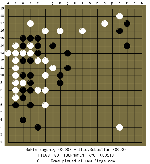 Last move : 0-1 2011 May 21 18:30:28 [Event "FICGS__GO__TOURNAMENT_KYU__000119"] [Site "FICGS"] [Date "2011.03.04"] [Round "1"] [Black "Bakin,Eugeniy"] [White "Ilie,Sebastian"] [Result "0-1"] [Rating 1 "0000"] [Rating 2 "0000"] 1.q16 d17 2.c4 q3 3.e3 o17 4.r14 q18 5.r17 l16 6.c15 c13 7.e15 f16 8.d12 d13 9.e13 e12 10.c12 b12 11.b13 b14 12.c14 d14 13.e14 a13 14.d15 b13 15.c10 b11 16.d10 b9 17.c8 b8 18.c7 b7 19.b6 c9 20.d9 b10 21.d6 f12 22.g14 h16 23.j13 f10 24.h10 f8 25.h9 g11 26.j11 e8 27.d8 f6 0-1 This go game has been lost on time (started : 2011.03.04 21:44:52) Here are the names of the openings (joseki) played in the four corners : Corner q16 : q16 o17 Hoshi (Hwajeom, Seongjeom, Xingwei`) 4-4 Point. The star or hoshi (4-4) point, emphasizing influence at the potential expense of territory. Ikken Kakari (Hankan Keolch'im, Yi Gua`jiao~, 1-Space Low Approach). White 2 is the standard approach move to the 4-4. Corner d16 : d17 c15 Komoku (Somok, Xiao~mu`) 3-4 Point. The komoku (3-4) point is the traditional corner enclosure move.. Ikken Kakari (Hankan Keolch'im, Yi Gua`jiao~, 1-Space Low Pincer). The small knight move is the basic approach move to the 3-4 point stone. It has been continually used for over four centuries. There are limitless variations, with new moves constantly being discovered. Black 2 opens the door to a treaure store of joseki. Player White won this Go (weiqi, baduk) game. Follow this game move after move (download)The game plays itself, the players don't control it. (Pierre Audouard) God, you are such an idiot. - Actually, I thought I was more of a jerk. (Gregory House to Stacy Warner, House M.D.)