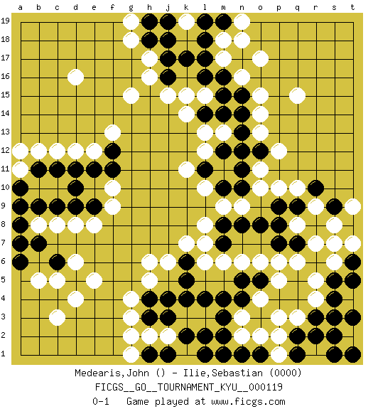Last move : 0-1 2011 May 6 21:31:27 [Event "FICGS__GO__TOURNAMENT_KYU__000119"] [Site "FICGS"] [Date "2011.03.04"] [Round "1"] [Black "Medearis,John"] [White "Ilie,Sebastian"] [Result "0-1"] [Rating 2 "0000"] 1.k4 q15 2.l4 d16 3.s3 d4 4.j4 q10 5.d10 d12 6.d11 c12 7.c11 c8 8.c9 d8 9.d9 e8 10.b9 b8 11.a9 b12 12.b11 a11 13.a10 a12 14.a8 o4 15.k17 m17 16.h4 g3 17.m3 n3 18.l2 n2 19.m2 j2 20.k2 h2 21.j1 k1 22.l1 g4 23.m4 r4 24.s4 r5 25.s5 s6 26.t5 r7 27.n1 o2 28.o1 p1 29.m1 n6 30.n5 o6 31.o5 p5 32.n4 p3 33.r3 q3 34.r2 k7 35.q2 p2 36.q1 t2 37.t3 h6 38.s1 l6 39.k5 j6 40.h3 h5 41.j3 g2 42.h1 g1 43.t6 t7 44.q7 q6 45.p7 p6 46.p8 o10 47.o8 n9 48.n8 m9 49.m8 l8 50.t1 h17 51.m16 n16 52.l16 o17 53.n15 o15 54.n14 o14 55.n13 o13 56.p9 p10 57.n12 j15 58.j16 h16 59.j17 k15 60.l17 m18 61.l18 l15 62.m15 l12 63.m19 n19 64.l19 n18 65.h18 g18 66.h19 g19 67.j18 k19 68.l14 m13 69.m12 l13 70.m14 k14 71.j19 g15 72.l11 m11 73.m10 l10 74.n11 k11 75.o12 p12 76.n10 o11 77.m7 m6 78.k6 l7 79.q9 r9 80.t8 s7 81.r8 s8 82.e9 f9 83.e11 e12 84.f11 f10 85.f12 f13 86.b7 b5 87.c6 c5 88.s9 q8 89.r10 t9 90.d5 c3 91.a6 e5 92.a7 d6 93.s2 pass 0-1 Here are the names of the openings (joseki) played in the four corners : Corner d4 : d4 j4 Hoshi (Hwajeom, Seongjeom, Xingwei`) 4-4 Point. The star or hoshi (4-4) point, emphasizing influence at the potential expense of territory. Player White won this Go (weiqi, baduk) game. Follow this game move after move (download)Strike at the waist of the knight's move. (Anonymous) No, no, you're not thinking; you're just being logical. (Niels Bohr)