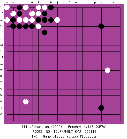 Last move : 1-0 2011 March 11 1:25:29 [Event "FICGS__GO__TOURNAMENT_KYU__000119"] [Site "FICGS"] [Date "2011.03.04"] [Round "1"] [Black "Ilie,Sebastian"] [White "Bencheikh,Ilf"] [Result "1-0"] [Rating 1 "0000"] [Rating 2 "0570"] 1.q16 d4 2.q3 r9 3.c16 j17 4.g17 e17 5.e16 f16 6.f17 d17 7.d16 c17 8.b17 b18 9.b16 f18 10.g18 e18 11.g15 g19 12.h19 f19 13.h17 a17 14.a18 a19 15.c19 d19 16.c18 1-0 Here are the names of the openings (joseki) played in the four corners : Corner q4 : q3 r9 Komoku (Somok, Xiao~mu`) 3-4 Point. The komoku (3-4) point is the traditional corner enclosure move.. Corner d16 : c16 j17 Komoku (Somok, Xiao~mu`) 3-4 Point. The komoku (3-4) point is the traditional corner enclosure move.. Player Black won this Go (weiqi, baduk) game. Follow this game move after move (download)The enemy's vital point is your own. (Anonymous) Ah, beer! The cause of, and the solution to, all of life's problems. (Homer Simpson)