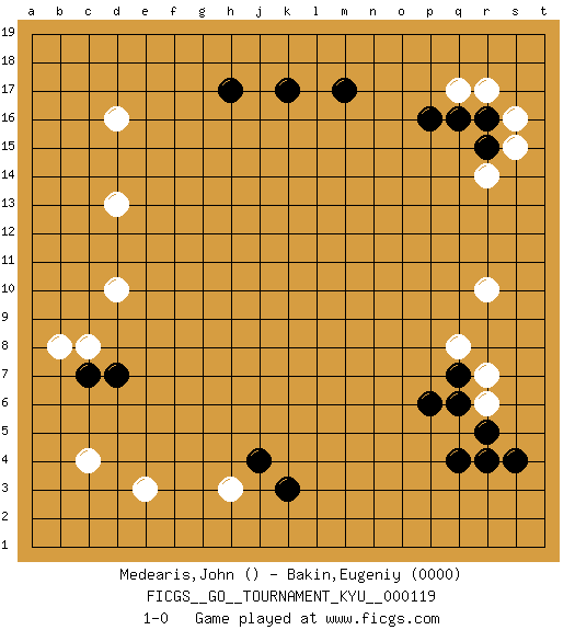 Last move : 1-0 2011 May 14 18:9:20 [Event "FICGS__GO__TOURNAMENT_KYU__000119"] [Site "FICGS"] [Date "2011.03.04"] [Round "1"] [Black "Medearis,John"] [White "Bakin,Eugeniy"] [Result "1-0"] [Rating 2 "0000"] 1.q4 c4 2.r4 e3 3.q16 r14 4.s4 r10 5.k17 s16 6.h17 d16 7.m17 d10 8.k3 h3 9.j4 d13 10.d7 c8 11.c7 b8 12.p6 r7 13.q7 q8 14.q6 r6 15.r5 r17 16.r15 s15 17.r16 q17 18.p16 1-0 This go game has been lost on time (started : 2011.03.04 21:44:52) Here are the names of the openings (joseki) played in the four corners : Corner q16 : q16 r14 Hoshi (Hwajeom, Seongjeom, Xingwei`) 4-4 Point. The star or hoshi (4-4) point, emphasizing influence at the potential expense of territory. Ikken Kakari (Hankan Keolch'im, Yi Gua`jiao~, 1-Space Low Approach). White 2 is the standard approach move to the 4-4. Corner d16 : h17 d16 This joseki is unknown. A weak or weird move has probably been played in this corner. Player Black won this Go (weiqi, baduk) game. Follow this game move after move (download)Empty triangles are bad. (Anonymous) The problem with manipulation is that people can turn on you. (Horatio Caine, C.S.I. Miami)