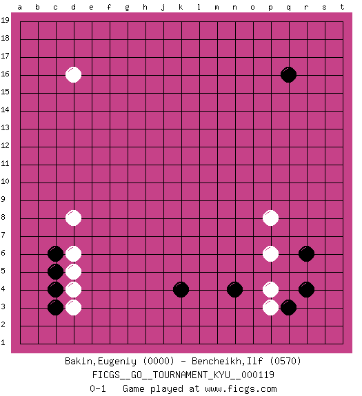 Last move : 0-1 2011 June 6 19:14:12 [Event "FICGS__GO__TOURNAMENT_KYU__000119 "] [Site "FICGS"] [Date "2011.03.04"] [Round "1"] [Black "Bakin,Eugeniy "] [White "Bencheikh,Ilf "] [Result "0-1"] [Rating 1 "0000"] [Rating 2 "0570"] 1.q16 d4 2.r4 d16 3.c6 d8 4.c3 d3 5.c4 d5 6.c5 d6 7.k4 p4 8.n4 p6 9.r6 p8 10.q3 p3 0-1 This go game has been lost on time (started : 2011.03.04 21:44:52) Here are the names of the openings (joseki) played in the four corners : Corner d4 : d4 c6Hoshi (Hwajeom, Seongjeom, Xingwei`) 4-4 Point. The star or hoshi (4-4) point, emphasizing influence at the potential expense of territory.Ikken Kakari (Hankan Keolch'im, Yi Gua`jiao~, 1-Space Low Approach). Black 2 is the standard approach move to the 4-4. Corner q4 : r4 p4Komoku (Somok, Xiao~mu`) 3-4 Point. The komoku (3-4) point is the traditional corner enclosure move..Ikken Takagakari (Hankan Nop'dakeolch'im, Yi Gaogua`jiao~, 1-Space High Approach). The 5-4 approach move has become more popular in modern times, as modern Go emphasizes speed and influence. Player White won this Go (weiqi, baduk) game.Follow this game move after move (download ) You can hide nothing on the goban. (Pierre Audouard) Perception is reality. (Immanuel Kant)