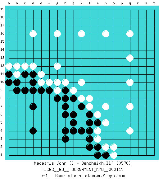 Last move : 0-1 2011 April 3 7:31:11 [Event "FICGS__GO__TOURNAMENT_KYU__000119"] [Site "FICGS"] [Date "2011.03.04"] [Round "1"] [Black "Medearis,John"] [White "Bencheikh,Ilf"] [Result "0-1"] [Rating 2 "0570"] 1.d10 d16 2.d9 q16 3.d4 q4 4.k4 m3 5.l4 c12 6.l3 m4 7.l2 q10 8.j4 k16 9.c11 d12 10.d11 b11 11.b10 b12 12.a10 q7 13.m2 n2 14.n1 o1 15.m1 o2 16.c9 g16 17.h3 q13 18.h4 n16 19.d7 k10 20.a11 a12 21.b9 l7 22.l5 m6 23.m5 n5 24.l6 n7 25.k7 l8 26.j6 g12 27.h7 h10 28.j8 k8 29.h9 j9 30.g8 g9 31.h8 g10 32.j5 e11 33.h6 e10 34.f9 f10 35.e9 pass 36.pass 0-1 Here are the names of the openings (joseki) played in the four corners : Player White won this Go (weiqi, baduk) game. Follow this game move after move (download)Corner, side, centre. (Anonymous) I've never seen so many men wasted so badly. (Blondie in The Good, The Bad and The Ugly)