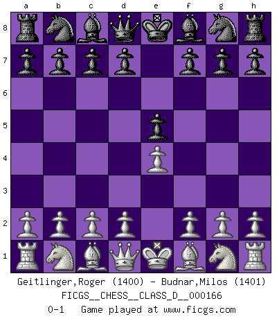 Last move : 0-1 2011 April 17 15:58:12 [Event "FICGS__CHESS__CLASS_D__000166"] [Site "FICGS"] [Date "2011.03.07"] [Round "1"] [White "Geitlinger,Roger"] [Black "Budnar,Milos"] [Result "0-1"] [WhiteElo "1400"] [BlackElo "1401"] 1.e4 e5 0-1 This chess game has been lost on time (started : 2011.03.07 1:48:9) King's pawn game Player Black won this chess game. Follow this game move after move (download)We cannot resist the fascination of sacrifice, since a passion for sacrifices is part of a Chessplayer's nature. (Rudolf Spielman) Viele Opfer benötigen überhaupt keine konkrete Berechnung. Es genügt sich die entstehende Position kurz vorzustellen, um uns davon zu überzeugen, dass das Opfer korrekt ist. (Mikhail Nekhemyevich Tal) De eso se trata el Ajedrez. Un día le das una lección a tu oponente y al día siguiente el te da una a tí. (Bobby Fischer) En blitz, le Cavalier l'emporte sur le Fou. (Vlastimil Hort) For peace of mind, resign as general manager of the universe. (Douglas Adams)