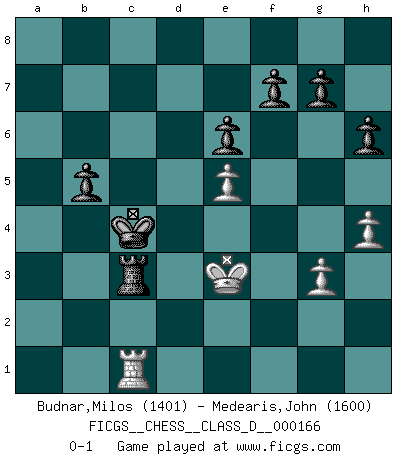 Last move : 0-1 2011 May 17 7:38:8 [Event "FICGS__CHESS__CLASS_D__000166"] [Site "FICGS"] [Date "2011.03.07"] [Round "1"] [White "Budnar,Milos"] [Black "Medearis,John"] [Result "0-1"] [WhiteElo "1401"] [BlackElo "1600"] 1.e4 e6 2.d4 d5 3.Nd2 Nf6 4.e5 Nfd7 5.Bd3 c5 6.c3 Nc6 7.Ne2 Qb6 8.Nf3 a5 9.Qa4 cxd4 10.Nexd4 Nc5 11.Qb5 Nxd3 12.Qxd3 Nxd4 13.Nxd4 Bc5 14.Qb5+ Qxb5 15.Nxb5 Ke7 16.O-O Bd7 17.a4 Rhc8 18.Be3 Bxe3 19.fxe3 Bxb5 20.axb5 Rc5 21.b4 Rxb5 22.Ra3 Ra6 23.bxa5 R6xa5 24.Rxa5 Rxa5 25.Rc1 b5 26.Kf2 Ra2+ 27.Kf3 Kd7 28.h4 Kc6 29.g3 h6 30.e4 Ra3 31.exd5+ Kxd5 32.Kf4 Kc4 33.Ke3 Rxc3+ 0-1 French : Tarrasch, Closed variation Kingside Castling by player White (move 16) Player Black won this chess game. Follow this game move after move (download)A Chess game is divided into three stages: the first, when you hope you have the advantage, the second when you believe you have an advantage, and the third... when you know you're going to lose ! (Savielly Tartakower) Ich verachte die Medien. (Robert James Fischer) Aún deseo matar a Fischer. (Boris Spassky) Toutes les manuvres exécutées sur une colonne ouverte ont pour but ultime l'intrusion définitive sur la septième ou la huitième rangée, en plein cur de la position ennemie. (Aaron Nimzovitch) You can't play chess if you're groggy from pills. (Anatoly Karpov)