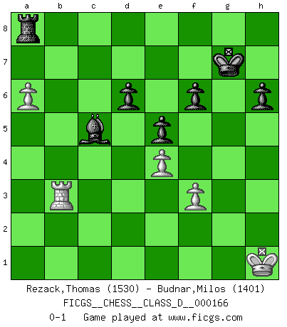 Last move : 0-1 2011 September 2 13:32:24 [Event "FICGS__CHESS__CLASS_D__000166"] [Site "FICGS"] [Date "2011.03.07"] [Round "1"] [White "Rezack,Thomas"] [Black "Budnar,Milos"] [Result "0-1"] [WhiteElo "1530"] [BlackElo "1401"] 1.e4 e5 2.Nf3 Nc6 3.Bb5 a6 4.Ba4 Nf6 5.O-O Be7 6.Re1 b5 7.Bb3 d6 8.c3 O-O 9.d4 Bg4 10.d5 Na5 11.Bc2 Rc8 12.a4 Ra8 13.Nbd2 c6 14.b4 Nc4 15.Nxc4 bxc4 16.dxc6 Qc7 17.a5 Qxc6 18.Ba4 Qb7 19.Bg5 Qc7 20.Re3 h6 21.Bh4 g5 22.Bg3 Nh5 23.Qd2 Rac8 24.h4 Nxg3 25.fxg3 Bxf3 26.gxf3 gxh4 27.gxh4 Bxh4 28.Qg2+ Kh8 29.Qh3 Bg5 30.Re2 Rcd8 31.Qh5 f6 32.Kh1 Qg7 33.Bc6 Kh7 34.Bd5 Rc8 35.Bxc4 Rxc4 36.Rb2 Rxc3 37.b5 axb5 38.Rxb5 Rc7 39.Qg4 Qd7 40.Qxd7+ Rxd7 41.a6 Be3 42.Rb7 Rg7 43.Ra3 Bc5 44.Rxg7+ Kxg7 45.Rb3 Ra8 0-1 Ruy Lopez : Closed Kingside Castling by player White (move 5) Kingside Castling by player Black (move 8) Player Black won this chess game. Follow this game move after move (download)Pawns: they are the soul of this game, they alone form the attack and defense. (Philidor) Stil? Ich habe keinen Stil! (Anatoly Karpov) Yo nunca en mi vida he jugado la Defensa Francesa, que viene siendo la más aburrida de todas las Aperturas. (Wilhelm Steinitz) Seul un grand joueur sait à quel point il joue faiblement. (Xavier Tartacover) The ego is not master in its own house. (Sigmund Freud)