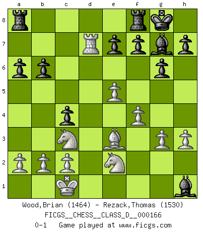 Last move : 0-1 2011 June 23 20:4:15 [Event "FICGS__CHESS__CLASS_D__000166"] [Site "FICGS"] [Date "2011.03.07"] [Round "1"] [White "Wood,Brian"] [Black "Rezack,Thomas"] [Result "0-1"] [WhiteElo "1464"] [BlackElo "1530"] 1.e4 c5 2.Nc3 Nc6 3.d3 g6 4.g3 Bg7 5.Bg2 Nf6 6.Nge2 O-O 7.Be3 b6 8.Qd2 Qc7 9.O-O-O a6 10.h3 d6 11.d4 c4 12.e5 dxe5 13.Bxc6 Qxc6 14.dxe5 Nd7 15.f4 Bb7 16.Qxd7 Qxd7 17.Rxd7 Bxh1 0-1 This chess game has been lost on time (started : 2011.03.07 1:48:9) Sicilian : Closed, 2...Nc6 Kingside Castling by player Black (move 6) Queenside Castling by player White (move 9) Player Black won this chess game. Follow this game move after move (download)Personally, I rather look forward to a computer program winning the world Chess Championship. Humanity needs a lesson in humility. (Richard Dawkings) Ich würde mich als ganz normalen Jungen bezeichnen [Im Alter von 12]. (Sergej Karjakin) El pensamiento metódico es mas útil en el Ajedrez que la inspiración. (C. J. S. Purdy) Les Echecs ont trois composantes : le temps, l'espace et le matériel en dernier. (Mikhail Tal) Luck is what you have left over after you give 100 percent. (Langston Coleman)