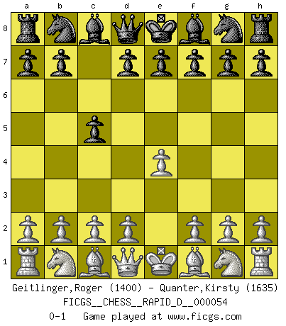 Last move : 0-1 2011 April 7 15:0:11 [Event "FICGS__CHESS__RAPID_D__000054"] [Site "FICGS"] [Date "2011.03.07"] [Round "1"] [White "Geitlinger,Roger"] [Black "Quanter,Kirsty"] [Result "0-1"] [WhiteElo "1400"] [BlackElo "1635"] 1.e4 c5 0-1 This chess game has been lost on time (started : 2011.03.07 1:54:34) Sicilian defense Player Black won this chess game. Follow this game move after move (download)You have to have the fighting spirit. You have to force moves and take chances. (Bobby Fischer) Die unerbitterlichsten Regeln im Schach sind die Ausnahmen. (Savielly Grigorievitsch Tartakower) Preferería tener un Peón que un dedo. (Reuben Fine) Même si l'adversaire joue le coup analysé précédemment, recommencez l'analyse en voyant la nouvelle position. Première règle de Blumenfeld Unless in communicating with it one says exactly what one means, trouble is bound to result. (Alan Turing, about computers)