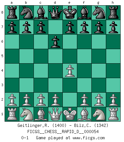 Last move : 0-1 2011 April 9 3:16:27 [Event "FICGS__CHESS__RAPID_D__000054"] [Site "FICGS"] [Date "2011.03.07"] [Round "1"] [White "Geitlinger,Roger"] [Black "Bilz,Constantin"] [Result "0-1"] [WhiteElo "1400"] [BlackElo "1342"] 1.e4 d6 0-1 This chess game has been lost on time (started : 2011.03.07 1:54:34) King's pawn Opening Player Black won this chess game. Follow this game move after move (download)Chess is everything: art, science and sport. (Anatoly Karpov) Wenn ich Weiß habe gewinne ich weil ich Weiß habe, wenn ich Schwarz habe gewinne ich weil ich Bogoljubov bin. (Efim Bogoljubov) Creo que una cierta cantidad de temperamento es esperada de los genios del Ajedrez. (Ron Gross) On entre au jeu d'Echecs comme on entre en Religion. Pour le joueur d'Echecs, la partie d'Echecs c'est l'office, la messe, le défilé du 1er Mai, le dépôt de gerbe au Monument aux Morts. C'est un drame sacré. (Michel Roos) When you don't know what to do, walk fast and look worried. (Anonymous)