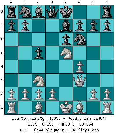 Last move : 0-1 2011 May 26 18:46:18 [Event "FICGS__CHESS__RAPID_D__000054"] [Site "FICGS"] [Date "2011.03.07"] [Round "1"] [White "Quanter,Kirsty"] [Black "Wood,Brian"] [Result "0-1"] [WhiteElo "1635"] [BlackElo "1464"] 1.e4 c5 2.f4 d5 3.exd5 Qxd5 4.Nc3 Qd8 5.Nf3 Nf6 6.Ne5 e6 7.Qf3 Be7 0-1 This chess game has been lost on time (started : 2011.03.07 1:54:34) Sicilian : Grand Prix attack Player Black won this chess game. Follow this game move after move (download)The beauty of a move lies not in its' appearance but in the thought behind it. (Siegbert Tarrasch) Ich spiele 70 Eröffnungssysteme. (Viktor Kortschnoi) Aún deseo matar a Fischer. (Boris Spassky) Tout change constamment, y compris dans le monde des Echecs. (Botvinnik) Secret operations are essential in war; upon them the army relies to make its every move. (Sun Tzu)