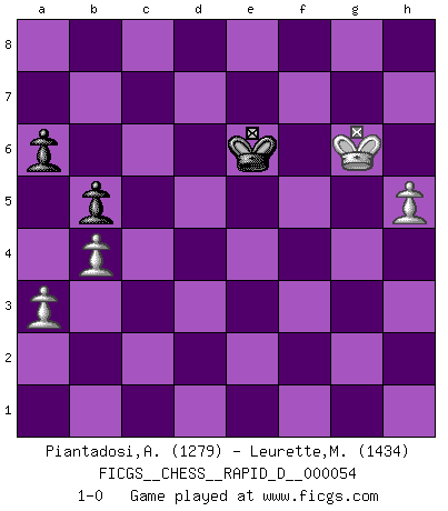 Last move : 1-0 2011 May 19 9:14:27 [Event "FICGS__CHESS__RAPID_D__000054"] [Site "FICGS"] [Date "2011.03.07"] [Round "1"] [White "Piantadosi,Angelo"] [Black "Leurette,Marc-Antoine"] [Result "1-0"] [WhiteElo "1279"] [BlackElo "1434"] 1.d4 d5 2.c4 c6 3.cxd5 cxd5 4.e3 Nc6 5.Nf3 Bg4 6.Be2 Nf6 7.O-O e6 8.Nc3 Be7 9.a3 O-O 10.Bd2 a6 11.Rc1 b5 12.Na2 Qd7 13.b4 e5 14.Nxe5 Nxe5 15.dxe5 Bxe2 16.Qxe2 Ne4 17.Rfd1 Qe6 18.f4 Rac8 19.Be1 Rxc1 20.Rxc1 f6 21.Nc3 fxe5 22.Nxe4 dxe4 23.Qc2 exf4 24.Bd2 f3 25.Qc6 Qf6 26.Qxe4 fxg2 27.Qxg2 Qf3 28.Qxf3 Rxf3 29.Rc6 Rf6 30.Rc8+ Bf8 31.Kg2 h6 32.Bc3 Rg6+ 33.Kf3 Re6 34.Bd4 g5 35.Bc5 Rf6+ 36.Kg4 Kg7 37.Bxf8+ Rxf8 38.Rxf8 Kxf8 39.Kh5 Kg7 40.e4 Kf6 41.Kxh6 Ke5 42.Kxg5 Kxe4 43.h4 Ke5 44.h5 Ke6 45.Kg6 1-0 QGD Slav defense : Exchange variation Kingside Castling by player White (move 7) Kingside Castling by player Black (move 9) 10 pieces endgame at move 38 : White KPPPP , Black KPPPP WHITE : King + 4 Pawns BLACK : King + 4 Pawns 9 pieces endgame at move 41 : White KPPPP , Black KPPP WHITE : King + 4 Pawns BLACK : King + 3 Pawns 8 pieces endgame at move 42 : White KPPPP , Black KPP WHITE : King + 4 Pawns BLACK : King + 2 Pawns 7 pieces endgame at move 42 : White KPPP , Black KPP WHITE : King + 3 Pawns BLACK : King + 2 Pawns Player White won this chess game. Follow this game move after move (download)Help your pieces so they can help you. (Paul Morphy) Kritik überlasse ich den Spießern. Ich zeige nichts, wofür ich mich schämen muss. (Alexandra Kosteniuk) El pensamiento metódico es mas útil en el Ajedrez que la inspiración. (C. J. S. Purdy) Les échecs c'est le défi de l'alpiniste, toujours plus haut, prêt à tout pour monter à l'assaut du Roi ennemi. Les échecs, c'est de la musique en mouvement, un ballet majestueux pour les yeux. C'est de la poésie composée par les fantômes du passé qui au même titre que Rimbaud ou Verlaine méritent notre admiration. Les échecs, c'est de la peinture ou le moindre mouvement modifie le tableau pour en faire un Picasso ou un Van Gogh. Les échecs, c'est tout et rien, c'est la vie et la mort. Jjulie33 sur le forum de France-Echecs. There are lots of people who mistake their imagination for their memory. (Josh Bilings)