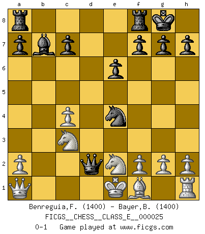 Last move : 0-1 2006 December 19 7:0:11 [Event "FICGS__CHESS__CLASS_E__000025"] [Site "FICGS"] [Date "2006.12.14"] [Round "1"] [White "Benreguia,Frederic"] [Black "Bayer,Bernhard"] [Result "0-1"] [WhiteElo "1400"] [BlackElo "1400"] 1.c4 Nf6 2.b4 e6 3.Ba3 Nc6 4.b5 Bxa3 5.bxc6 Bb2 6.cxb7 Bxb7 7.Nc3 Bxa1 8.Qxa1 O-O 9.d3 d5 10.e4 dxe4 11.dxe4 Nxe4 12.Nge2 Qd2+ 0-1 English orang-utan Kingside Castling by player Black (move 8) Player Black won this chess game. Follow this game move after move (download)You know, comrade Pachman, I don't enjoy being a Minister, I would rather play Chess like you. (Che Guevara) Ja, ich habe einmal eine Blitzpartie gespielt, es war in einem Zug, 1929. --im Interview 1989 (Mikhail Moiseyevich Botvinik) La vida es como el Ajedrez, con lucha, competición y eventos buenos y malos. (Benjamin Franklin) Que feriez-vous si vous étiez en train de jouer aux échecs et que la fin du monde arrive ? Je continuerais à jouer. (Saint Borromée) Statistics can be made to prove anything - even the truth. (Author unknown)