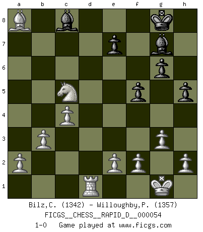 Last move : 1-0 2011 March 26 23:52:5 [Event "FICGS__CHESS__RAPID_D__000054"] [Site "FICGS"] [Date "2011.03.07"] [Round "1"] [White "Bilz,Constantin"] [Black "Willoughby,Peter"] [Result "1-0"] [WhiteElo "1342"] [BlackElo "1357"] 1.Nf3 Nf6 2.g3 g6 3.Bg2 Bg7 4.O-O O-O 5.c4 c5 6.Nc3 d6 7.d4 cxd4 8.Nxd4 Nc6 9.Nxc6 bxc6 10.Bxc6 Rb8 11.Bg2 Be6 12.b3 Nd7 13.Qc2 a5 14.Rb1 f5 15.Rd1 Nc5 16.Be3 Qe8 17.Bxc5 dxc5 18.Na4 Qc8 19.Qd2 Rd8 20.Qxa5 Ra8 21.Rxd8+ Qxd8 22.Qxa8 Qxa8 23.Bxa8 h5 24.Nxc5 Bc8 25.Rd1 1-0 Reti : King's Indian attack Kingside Castling by player White (move 4) Kingside Castling by player Black (move 4) Player White won this chess game. Follow this game move after move (download)A big shock; the best chess player in history has passed away. (Lajos Portisch, about Bobby Fischer's death) Aljechin war kein Nazi. Er war ein Opportunist. Ein schrecklicher Mann. Er liebte Geld über alles und würde für Geld ein Jude, ein Katolik oder ein Protestant werden. (Miguel Najdorf) Una clavada es mas poderosa que una espada. (Fred Reinfeld) Karpov est une pièce de musée. (Garry Kasparov) Bobby never cared about money, though. His only desire was to prove that his choices were correct: He wanted chess to be important because he was a chess player, and he wanted to be important. Bobby knew money was important, but he didn't have a clue why, outside of clothes and status. The only way he could accomplish what he wanted was to fight for a lot of money. Once he got it, he gave it away. He did not know how to spend it. And once he'd become champion, after, essentially, sacrificing his life for it, he didn't know how to spend his time. (Bob Wade)