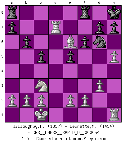 Last move : 1-0 2011 March 10 16:8:20 [Event "FICGS__CHESS__RAPID_D__000054"] [Site "FICGS"] [Date "2011.03.07"] [Round "1"] [White "Willoughby,Peter"] [Black "Leurette,Marc-Antoine"] [Result "1-0"] [WhiteElo "1357"] [BlackElo "1434"] 1.d4 c5 2.d5 e5 3.d6 Qf6 4.Nf3 Bxd6 5.Bg5 Qf5 6.Qxd6 Qe6 7.Qxe6+ dxe6 8.Nc3 Nc6 9.O-O-O Nge7 10.Bxe7 Nxe7 11.Nxe5 O-O 12.g3 f6 13.Nd7 Bxd7 14.Rxd7 Ng6 15.Bh3 e5 16.Be6+ Kh8 17.h4 b6 18.h5 1-0 Old Benoni defense Queenside Castling by player White (move 9) Kingside Castling by player Black (move 11) Player White won this chess game. Follow this game move after move (download)Your body has to be in top condition. Your Chess deteriorates as your body does. You can't separate body from mind. (Bobby Fischer) Der Bart als Geschlechtszeichen mitten im Gesicht ist obszön. Daher gefällt er den Weibern. [Zugegeben, kein Schachzitat, aber unglaublich originell] (Arthur Schopenhauer) Con el tiempo, empecé a progresar en partidas decisivas. Tal vez porque me di cuenta de una simple verdad: no solo estaba yo nervioso sino también mi oponente. (Mikhail Tal) Lorsque vous vous retrouvez devant une position atroce, ne tendez pas un ultime piège dérisoire avec l'intention d'abandonner si l'adversaire le déjoue ! Faites-vous plutôt un devoir de résister comme si votre vie en dépendait. Jouez le coup qui vous déplairait au centuple si vous étiez dans la peau de votre tortionnaire ! Luck never made a man wise. (Seneca, Letters to Lucilius)