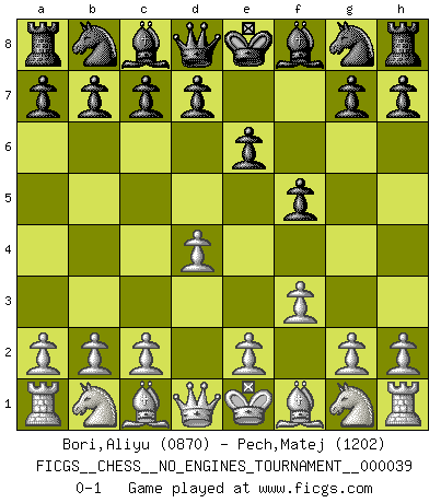 Last move : 0-1 2011 April 28 4:44:58 [Event "FICGS__CHESS__NO_ENGINES_TOURNAMENT__000039"] [Site "FICGS"] [Date "2011.03.08"] [Round "1"] [White "Bori,Aliyu"] [Black "Pech,Matej"] [Result "0-1"] [WhiteElo "0870"] [BlackElo "1202"] 1.d4 f5 2.f3 e6 0-1 This chess game has been lost on time (started : 2011.03.08 0:2:9) Dutch Player Black won this chess game. Follow this game move after move (download)The defensive power of a pinned piece is only imaginary. (Aaron Nimzovich) Garry Kasparov war erst in der Großmeister-Organisation GMA, dann in der Profischach-Vereinigung PCA, zum Schluss kehrte er wieder in den Schoß der FIDE zurück. Aber gut, manche Leute sind flexibel (Viswanathan Anand) Muchos jugadores de Ajedrez se sorprendían cuando después de la partida, Fischer explicaba con calma: 'Yo ya había analizado esta posibilidad' en una posición en la cual yo creía que no era posible de prever desde la apertura. (Mikhail Tal) Soyez une menace à chaque fois que vous vous asseyez pour jouer. (Ken Smith) Life is verb, not a noun. (Charlotte Perkins Gilman)