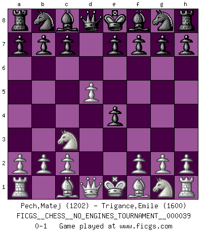 Last move : 0-1 2011 May 15 18:10:37 [Event "FICGS__CHESS__NO_ENGINES_TOURNAMENT__000039"] [Site "FICGS"] [Date "2011.03.08"] [Round "1"] [White "Pech,Matej"] [Black "Trigance,Emile"] [Result "0-1"] [WhiteElo "1202"] [BlackElo "1600"] 1.e4 Nc6 2.d4 d5 3.Nc3 dxe4 4.d5 Nb8 0-1 This chess game has been lost on time (started : 2011.03.08 0:2:9) KP : Nimzovich defense, Bogolyubov variation Player Black won this chess game. Follow this game move after move (download)You can only get good at Chess if you love the game. (Bobby Fischer) Ich verachte die Medien. (Robert James Fischer) Una partida de Ajedrez se divide en 3 etapas: la primera cuando piensas que tienes la ventaja, la segunda cuando crees que tienes la ventaja y la tercera... ¡cuando te das cuenta que vas a perder!. (Savielly Tartakower) Le succès, c'est être capable d'aller d'échec en échec sans perdre son enthousiasme. (Winston Churchill) Wisdom begins at the end. (Daniel Webster)