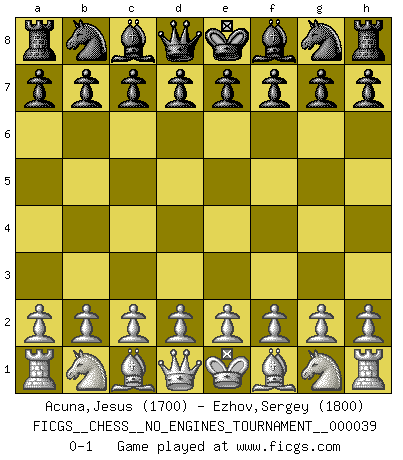Last move : 0-1 2011 April 18 16:2:31 [Event "FICGS__CHESS__NO_ENGINES_TOURNAMENT__000039"] [Site "FICGS"] [Date "2011.03.08"] [Round "1"] [White "Acuna,Jesus"] [Black "Ezhov,Sergey"] [Result "0-1"] [WhiteElo "1700"] [BlackElo "1800"] 0-1 This chess game has been lost on time (started : 2011.03.08 0:2:9) Player Black won this chess game. Follow this game move after move (download)You cannot play at Chess if you are kind-hearted. (French Proverb) Ich liebe den Moment, wenn ich das Ego meines Gegenüber breche. (Robert James Fischer) Un Peón pasado es un criminal, quién debe ser mantenido bajo candado y llave. Leves medidas, tales como vigilancia policiaca, no son suficientes. (Aaron Nimzovich) Le moment que je préfère le plus dans une rencontre, c'est celui où je sens que la personnalité de l'adversaire se brise. (Robert Fischer) Just because you do not take an interest in politics doesn't mean politics won't take an interest in you. (Pericles 430 B.C.)