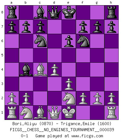 Last move : 0-1 2011 April 21 4:6:29 [Event "FICGS__CHESS__NO_ENGINES_TOURNAMENT__000039"] [Site "FICGS"] [Date "2011.03.08"] [Round "1"] [White "Bori,Aliyu"] [Black "Trigance,Emile"] [Result "0-1"] [WhiteElo "0870"] [BlackElo "1600"] 1.d4 Nf6 2.e3 Nc6 3.c3 d5 4.c4 dxc4 5.Bxc4 e6 6.Ne2 Bb4+ 0-1 This chess game has been lost on time (started : 2011.03.08 0:2:9) Queen's pawn game Player Black won this chess game. Follow this game move after move (download)In blitz, the Knight is stronger than the Bishop. (Vlastimil Hort) Ich möchte Schüler heranbilden, die das Vermögen haben, selbst zu denken und Kritik zu üben. (Emanuel Lasker) El Rey es una pieza de pelea. ¡Usenlo!. (Wilhelm Steinitz) Un footballeur joue avec ses pieds, parfois avec sa tête. Un joueur d'échecs ne joue qu'avec sa tête. Et quand il ne joue plus, il meurt. (Jacob Murray) The intuitive mind is a sacred gift; the rational mind is a faithful servant. We have created a society that honors the servant but has forgotten the gift. (Albert Einstein)