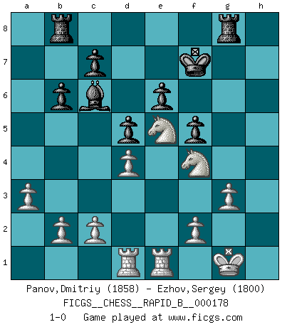 Last move : 1-0 2011 May 18 19:9:51 [Event "FICGS__CHESS__RAPID_B__000178"] [Site "FICGS"] [Date "2011.03.08"] [Round "1"] [White "Panov,Dmitriy"] [Black "Ezhov,Sergey"] [Result "1-0"] [WhiteElo "1858"] [BlackElo "1800"] 1.e4 d6 2.d4 Nf6 3.Nc3 g6 4.Nf3 Bg7 5.Be2 O-O 6.O-O e6 7.Bg5 Re8 8.Qd2 Nc6 9.Rad1 a6 10.Qc1 d5 11.e5 h6 12.Bxf6 Bxf6 13.exf6 Qxf6 14.Qxh6 Qg7 15.Qxg7+ Kxg7 16.a3 f6 17.Rfe1 Bd7 18.g3 b6 19.Bf1 g5 20.h4 gxh4 21.Nxh4 Kf7 22.Ne2 Rh8 23.Nf4 Rae8 24.Bd3 f5 25.Bxa6 Ra8 26.Bb7 Rab8 27.Bxc6 Bxc6 28.Nhg6 Rhg8 29.Ne5+ 1-0 Pirc : Classical system, 5.Be2 Kingside Castling by player Black (move 5) Kingside Castling by player White (move 6) Player White won this chess game. Follow this game move after move (download)A player surprised is half beaten. (Proverb) Kann Schach nicht schließlich das Nationalspiel der Deutschen werden? Und welche weiteren Ausblicke bieten sich dann dar! Welche Hebung des allgemeinen Kultur-Niveaus, ja der Moral, wenn das Schachbrett den Kartentisch verdrängen würde! Wahrlich, ein Ziel, des Schweißes der Edlen wert! (Siegbert Tarrasch) No es una movida, aún la mejor movida que tu debas buscar, sino un plan comprensible. (Eugene Znosko-Borovsky) Nous sommes les pions de la mystérieuse partie d'Echecs jouée par Dieu. Il nous déplace, nous arrête, nous pousse encore, puis nous lance un à un dans la boîte du Néant. Epitaphe sur la tombe de David Janowsky (1868-1927). Hello Thibault, if I have had a plan (and I had one, I hope), I have forgotten it during the last week... - Hello Heinz-Georg. What do you mean a plan ? (Anonymous players, during a Big Chess game)