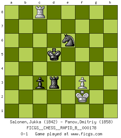 Last move : 0-1 2011 August 11 10:21:38 [Event "FICGS__CHESS__RAPID_B__000178"] [Site "FICGS"] [Date "2011.03.08"] [Round "1"] [White "Salonen,Jukka"] [Black "Panov,Dmitriy"] [Result "0-1"] [WhiteElo "1842"] [BlackElo "1858"] 1.e4 e5 2.Nf3 Nc6 3.Bb5 a6 4.Bxc6 dxc6 5.O-O f6 6.d4 exd4 7.Nxd4 c5 8.Ne2 Qxd1 9.Rxd1 Bd7 10.Be3 O-O-O 11.Nbc3 Bd6 12.Bf4 Bxf4 13.Nxf4 Ne7 14.f3 Rhf8 15.Rd2 f5 16.e5 g5 17.Nfd5 Ng6 18.Rad1 Be6 19.Kf2 h6 20.h4 gxh4 21.Ke3 Bxd5 22.Rxd5 f4+ 23.Kf2 Rxd5 24.Rxd5 Rf5 25.Rxc5 Nxe5 26.Rd5 Rh5 27.Rd1 h3 28.Nd5 Ng6 29.c4 h2 30.Rh1 c6 31.Nf6 Ra5 32.a3 Ne5 33.Rxh2 Nxc4 34.b3 Ne5 35.a4 Nd3+ 36.Kg1 Nc1 37.Rh4 Kc7 38.Kf2 Nxb3 39.Rxf4 Nc5 40.Rh4 Rxa4 41.g4 b5 42.Rxh6 b4 43.g5 b3 44.Rh1 b2 45.Rb1 Rb4 46.g6 Ne6 47.Ne4 a5 48.Nc3 a4 49.Nxa4 Rxa4 50.Rxb2 Ra5 51.Re2 Kd7 52.Rd2+ Ke7 53.Rc2 Rc5 54.Re2 Kf6 55.Re4 Rg5 56.Ke3 Rxg6 57.Rh4 Kf5 58.Rh8 c5 59.Rh1 Nf4 60.Rc1 Re6+ 61.Kd2 Rd6+ 62.Ke3 Rd3+ 63.Kf2 Ne6 64.Ke2 Rb3 65.Rc4 Ke5 66.Kf2 Kd5 67.Rg4 c4 68.Rg8 Rd3 69.Rc8 c3 0-1 Ruy Lopez : Exchange, Gligoric variation Kingside Castling by player White (move 5) Queenside Castling by player Black (move 10) 10 pieces endgame at move 49 : White KRNPP , Black KRNPP WHITE : King + 1 Rook 1 Knight 2 Pawns BLACK : King + 1 Rook 1 Knight 2 Pawns 9 pieces endgame at move 49 : White KRPP , Black KRNPP WHITE : King + 1 Rook 2 Pawns BLACK : King + 1 Rook 1 Knight 2 Pawns 8 pieces endgame at move 50 : White KRPP , Black KRNP WHITE : King + 1 Rook 2 Pawns BLACK : King + 1 Rook 1 Knight 1 Pawn 7 pieces endgame at move 56 : White KRP , Black KRNP WHITE : King + 1 Rook 1 Pawn BLACK : King + 1 Rook 1 Knight 1 Pawn Player Black won this chess game. Follow this game move after move (download)Man is a frivolous, a specious creature, and like a Chess player, cares more for the process of attaining his goal than for the goal itself. (Dostoyevsky) Es ist wirklich schade, dass so viele Schachspieler nicht auf ihr Äußeres achten! (Alexandra Kosteniuk) Si un gobernante no entiende al Ajedrez, ¿como puede governar él un reinado?. (El Rey Khusros II) On a dit que l'homme se distingue de l'animal par le fait qu'il achète plus de livres qu'il ne peut en lire. Je voudrais suggérer qu'inclure à la liste des livres quelques livres d'échecs rendrait la distinction manifeste. (Edward Lasker) Do not put your faith in what statistics say until you have carefully considered what they do not say. (William W. Watt)