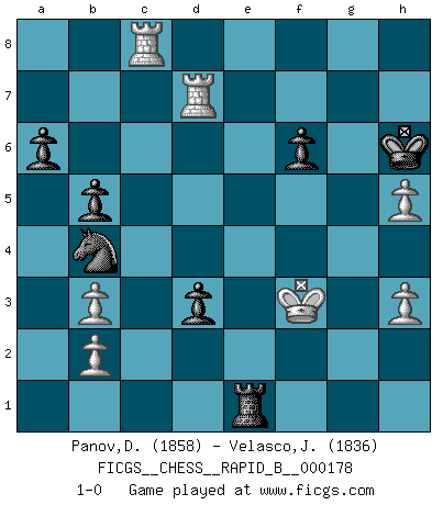 Last move : 1-0 2011 March 17 20:19:32 [Event "FICGS__CHESS__RAPID_B__000178"] [Site "FICGS"] [Date "2011.03.08"] [Round "1"] [White "Panov,Dmitriy"] [Black "Velasco,Jose Maria"] [Result "1-0"] [WhiteElo "1858"] [BlackElo "1836"] 1.e4 c5 2.c3 Nf6 3.e5 Nd5 4.d4 cxd4 5.cxd4 g6 6.Bc4 Nb6 7.Bb3 Nc6 8.d5 Na5 9.d6 Nxb3 10.axb3 exd6 11.exd6 Qf6 12.Be3 Qe6 13.Nc3 Bxd6 14.Nf3 Bc5 15.Nb5 O-O 16.Nc7 Qe7 17.Nxa8 Nxa8 18.Qe2 Bb4+ 19.Bd2 a6 20.Qxe7 Bxe7 21.Rc1 d5 22.O-O Bg4 23.Rfe1 Bd6 24.Bh6 Rd8 25.Bg5 Rb8 26.Ne5 Bf5 27.f3 Nc7 28.g4 Be6 29.Bf4 Nb5 30.Nd3 Rd8 31.Bxd6 Rxd6 32.Nc5 Nd4 33.Rc3 Rb6 34.Rd3 Nc2 35.Rc1 Nb4 36.Rd2 h6 37.Na4 Rd6 38.Rc7 b5 39.Nc5 d4 40.Kf2 g5 41.Ke2 Kf8 42.h3 Kg8 43.Ra7 Kh7 44.f4 gxf4 45.Kf3 Kg8 46.Kxf4 d3 47.Ke3 Nc2+ 48.Kf2 Nb4 49.Nxe6 Rxe6 50.Rd7 Kg7 51.Kg2 Kg6 52.Rf2 f6 53.Rf5 Re2+ 54.Kf3 Re1 55.Rc5 h5 56.gxh5+ Kh6 57.Rc8 1-0 Sicilian : Alapin's variation (2.c3) Kingside Castling by player Black (move 15) Kingside Castling by player White (move 22) Player White won this chess game. Follow this game move after move (download)First-class players lose to second-class players because second-class players sometimes play a first-class game. (Siegbert Tarrasch) Jede Eröffnung ist gut genug um gespielt zu werden, wenn nur ihr Ruf schlecht genug ist. (Savielly Grigorievitsch Tartakower) Hay dos clases de hombres: aquellos que se conforman en dejarse llevar por las circunstancias y que juegan barajas y aquellos decididos a controlar las circunstancias y que juegan al Ajedrez. (Mortimer Collins) Je ne suis pas le dernier à jouer lâchement des coups douteux pendant le zeïtnot de l'adversaire pour l'achever: en effet les coups qui font le plus peur sont ceux que l'on ne comprend pas. Je me fais souvent peur quand je joue. (Un professeur anonyme) Life is like a play: it's not the length but the excellence of the acting that matters. (Seneca)