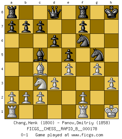 Last move : 0-1 2011 March 10 22:49:40 [Event "FICGS__CHESS__RAPID_B__000178"] [Site "FICGS"] [Date "2011.03.08"] [Round "1"] [White "Chang,Henk"] [Black "Panov,Dmitriy"] [Result "0-1"] [WhiteElo "1800"] [BlackElo "1858"] 1.e4 e5 2.Nf3 Nf6 3.Nc3 Nc6 4.Bc4 Bc5 5.O-O O-O 6.d3 d6 7.Bg5 h6 8.Bh4 Bg4 9.h3 Bxf3 10.Qxf3 Nd4 11.Qg3 g5 12.Bxg5 hxg5 13.Qxg5+ Kh8 14.g4 Nf3+ 15.Kh1 Nxg5 0-1 Petrov Three knights game Kingside Castling by player White (move 5) Kingside Castling by player Black (move 5) Player Black won this chess game. Follow this game move after move (download)In Chess, as it is played by masters, chance is practically eliminated. (Emanuel Lasker) Mein Gehirn das ist mein zweitwichtigstes Organ [Aus dem Film: Der Schläfer]. (Woody Allen) Cada Peón es potencialmente una Reina. (James Mason) Comme les marins qui ont mille raisons différentes d'aller en mer, les joueurs d'échecs en ont tout autant avant de s'installer devant une table et jouer... (Vincent Bertignac, philosophe) Wisdom doesn't necessarily come with age. Sometimes age just shows up all by itself. (Tom Wilson)