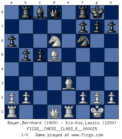 Last move : 1-0 2006 December 19 3:7:23 [Event "FICGS__CHESS__CLASS_E__000025"] [Site "FICGS"] [Date "2006.12.14"] [Round "1"] [White "Bayer,Bernhard"] [Black "Kis-Kos,Laszlo"] [Result "1-0"] [WhiteElo "1400"] [BlackElo "1200"] 1.e4 e5 2.Nf3 Nc6 3.Bb5 a6 4.Ba4 Nf6 5.O-O Be7 6.Re1 b5 7.Bb3 O-O 8.d4 Nxd4 9.Nxd4 exd4 10.e5 Ne8 11.c3 dxc3 12.Nxc3 d6 13.Bd5 Rb8 14.Be3 c5 15.exd6 Bxd6 16.Ne4 Nf6 17.Nxd6 1-0 Ruy Lopez : Closed, 7...O-O Kingside Castling by player White (move 5) Kingside Castling by player Black (move 7) Player White won this chess game. Follow this game move after move (download)A good player is always lucky. (Jose Raul Capablanca) Über Kasparov: Es ist offensichtlich, daß er in einem totalitären Staat aufwuchs und deshalb zu diktatorischen Zügen neigt. (Viktor Kortschnoi) El Ajedrez no es como la vida... ¡tiene reglas!. (Mark Pasternak) Il n'y a pas de prix trop élevé au scalp de l'ennemi. (Koblentz) Perseverance does not equal worthiness. Next time you want to get my attention, wear something fun. Low-riding jeans are hot. (Gregory House, House M.D.)