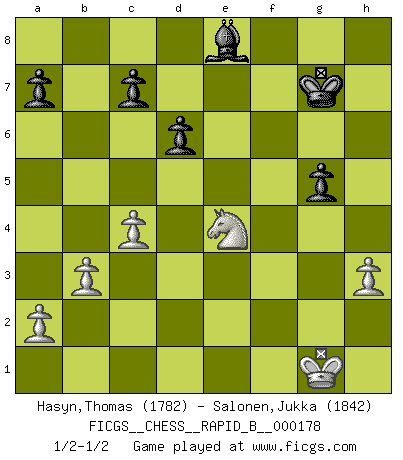 Last move : 1/2-1/2 2011 June 4 8:44:19 [Event "FICGS__CHESS__RAPID_B__000178"] [Site "FICGS"] [Date "2011.03.08"] [Round "1"] [White "Hasyn,Thomas"] [Black "Salonen,Jukka"] [Result "1/2-1/2"] [WhiteElo "1782"] [BlackElo "1842"] 1.c4 e5 2.g3 Nc6 3.Bg2 Nf6 4.Nc3 g6 5.e4 Bg7 6.Nge2 O-O 7.O-O d6 8.f4 Bg4 9.h3 Bd7 10.d3 Nd4 11.f5 gxf5 12.exf5 Nxf5 13.g4 Nh4 14.Bxb7 Rb8 15.Bh1 Ne8 16.Ng3 f5 17.Nxf5 Nxf5 18.gxf5 Rxf5 19.Rxf5 Bxf5 20.Qh5 Bxd3 21.Bd5+ Kh8 22.Bg5 Qd7 23.Qf3 Bg6 24.Rf1 h6 25.Bc6 e4 26.Qf8+ Bxf8 27.Rxf8+ Kh7 28.Bxd7 hxg5 29.b3 Kg7 30.Bxe8 Rxe8 31.Rxe8 Bxe8 32.Nxe4 1/2-1/2 English Opening Kingside Castling by player Black (move 6) Kingside Castling by player White (move 7) This chess game ended in a draw. Follow this game move after move (download)A good player is always lucky. (Jose Raul Capablanca) Deine Wertungszahl - vorausgesetzt einige Jahre schachliche Anstrengung - entspricht etwa dem zehnfachen Deines IQ plus 1000. (Jonathan Levitt) Hoy en día, si tu no eres un Gran Maestro a los 14 años, es mejor que lo olvides. (Anand Viswanathan) Les échecs sont un jeu par leur forme, un art par leur essence et une science par sa difficulté d'acquisition. Ils peuvent vous procurer autant de plaisir qu'un bon livre ou une belle musique, mais vous n'aurez une réelle joie que si vous arrivez à bien jouer. (Tigran Petrosian) Art disturbs, science reassures. (Georges Braque, Le Jour et la Nuit)