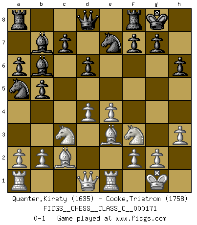 Last move : 0-1 2011 July 9 8:12:36 [Event "FICGS__CHESS__CLASS_C__000171"] [Site "FICGS"] [Date "2011.03.09"] [Round "1"] [White "Quanter,Kirsty"] [Black "Cooke,Tristrom"] [Result "0-1"] [WhiteElo "1635"] [BlackElo "1758"] 1.e4 e5 2.Nf3 Nc6 3.Bb5 Bc5 4.O-O d6 5.c3 a6 6.Ba4 b5 7.Bc2 Nge7 8.d4 exd4 9.cxd4 Bb6 10.h3 O-O 11.Nc3 h6 12.Re1 Bb7 13.Be3 Na5 0-1 This chess game has been lost on time (started : 2011.03.09 12:10:3) Ruy Lopez : Classical (Cordel) defense Kingside Castling by player White (move 4) Kingside Castling by player Black (move 10) Player Black won this chess game. Follow this game move after move (download)I prefer to lose a really good game than to win a bad one. (David Levy) Die Partien sind immer verschieden, die Interviews immer die gleichen. (Garry Kasparov) Cuando tu casa esta en llamas, no puedes ser molestado por tus vecinos. O, como decinos en Ajedrez, si tu Rey esta bajo ataque, no te preocupa perder un Peón del lado de la Reina. (Gary Kasparov) Mon pion favori sur ma case favorite ! Bronstein en parlant d'un coup de pion en h5 quand il avait les Noirs. You can think I'm wrong, but that's no reason to quit thinking. (Gregory House, House M.D.)