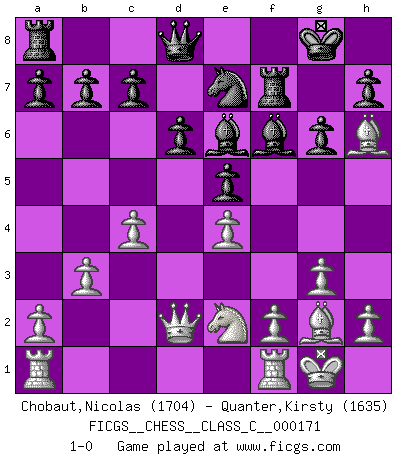 Last move : 1-0 2011 May 28 6:52:29 [Event "FICGS__CHESS__CLASS_C__000171"] [Site "FICGS"] [Date "2011.03.09"] [Round "1"] [White "Chobaut,Nicolas"] [Black "Quanter,Kirsty"] [Result "1-0"] [WhiteElo "1704"] [BlackElo "1635"] 1.c4 e5 2.g3 Nc6 3.Bg2 f5 4.Nc3 Nf6 5.d3 g6 6.e4 d6 7.Nge2 Bg7 8.O-O O-O 9.Nd5 Ne7 10.Nxf6+ Bxf6 11.Bh6 Rf7 12.Qd2 fxe4 13.dxe4 Be6 14.b3 1-0 English Opening Kingside Castling by player White (move 8) Kingside Castling by player Black (move 8) Player White won this chess game. Follow this game move after move (download)Before the endgame, the Gods have placed the middle game. (Siegbert Tarrasch) Ich verstehe mehr vom Schach als irgendein anderer lebender Meister. (José Raúl Capablanca) El Ajedrez lo es todo: arte, ciencia y deporte. (Anatoly Karpov) Dieu déplace le joueur, et celui-ci la pièce. Quel Dieu derrière Dieu commence donc la trame ? Arturo Perez-Reverte (prix de littérature policière 1993). Over-the-board chess is the favorite of mortals, correspondence chess is the favorite of the gods. (Eduard Dyckhoff)