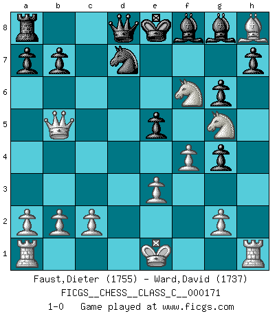 Last move : 1-0 2011 April 28 0:20:3 [Event "FICGS__CHESS__CLASS_C__000171"] [Site "FICGS"] [Date "2011.03.09"] [Round "1"] [White "Faust,Dieter"] [Black "Ward,David"] [Result "1-0"] [WhiteElo "1755"] [BlackElo "1737"] 1.d4 f5 2.Bg5 g6 3.Nc3 d5 4.h4 Nf6 5.h5 Bg7 6.h6 Bf8 7.Nh3 Be6 8.Bf4 c6 9.Ng5 Bg8 10.e3 Ng4 11.Be2 Nxh6 12.Be5 e6 13.f4 Nd7 14.Bxh8 c5 15.dxc5 e5 16.Nxd5 Ng4 17.Bxg4 fxg4 18.Qd3 Nxc5 19.Qb5+ Nd7 20.Nf6+ 1-0 Dutch, 2.Bg5 variation Player White won this chess game. Follow this game move after move (download)Only the player with the initiative has the right to attack. (Wilhelm Steinitz) Gewöhnliche Menschen denken nur daran, wie sie ihre Zeit verbringen. Ein intelligenter Mensch versucht, sie auszunutzen. (Arthur Schopenhauer) Hoy en día, si tu no eres un Gran Maestro a los 14 años, es mejor que lo olvides. (Anand Viswanathan) Le thème de l'attaque double intervient d'une manière ou d'une autre dans l'immense majorité des combinaisons. (Youri Averbakh) The hypothalamus is one of the most important parts of the brain, involved in many kinds of motivation, among other functions. The hypothalamus controls the 'Four Fs: Fighting, Fleeing, Feeding and Mating. (Unknown author)