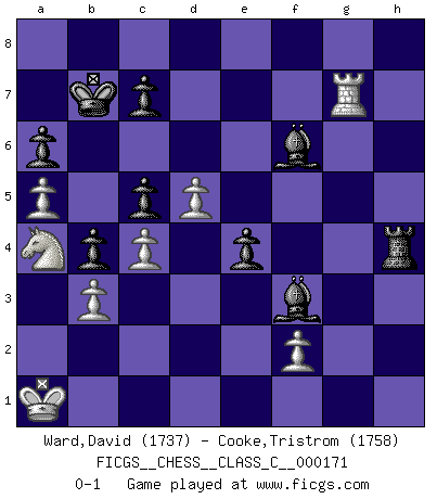 Last move : 0-1 2011 October 19 21:41:46 [Event "FICGS__CHESS__CLASS_C__000171"] [Site "FICGS"] [Date "2011.03.09"] [Round "1"] [White "Ward,David"] [Black "Cooke,Tristrom"] [Result "0-1"] [WhiteElo "1737"] [BlackElo "1758"] 1.e4 e5 2.Nf3 Nc6 3.Bb5 Bc5 4.c3 a6 5.Bxc6 dxc6 6.Nxe5 Qg5 7.d4 Qxg2 8.Qf3 Qxf3 9.Nxf3 Bf8 10.Bf4 Bg4 11.Ne5 Be6 12.Nd2 O-O-O 13.O-O-O Ne7 14.h4 Ng6 15.Nxg6 hxg6 16.Be3 Be7 17.Bg5 f6 18.Bf4 Rh5 19.Bg3 f5 20.b3 fxe4 21.Rh2 Ba3+ 22.Kb1 Bf5 23.Ka1 Rdh8 24.Nc4 Be7 25.Rdh1 c5 26.d5 b5 27.Nb2 Bg4 28.c4 Bf3 29.Rg1 g5 30.Be5 gxh4 31.Bxg7 Rg8 32.Rg6 Kb7 33.a4 b4 34.a5 Rh7 35.Na4 R8xg7 36.Rxh4 Rxh4 37.Rxg7 Bf6+ 0-1 Comment by player 1 : David Ward : Well played. You are a strong player. Good luck. Ruy Lopez : Classical defense, 4.c3 Queenside Castling by player Black (move 12) Queenside Castling by player White (move 13) Player Black won this chess game. Follow this game move after move (download)If cunning alone were needed to excel, women would be the best Chess players. (Albin) Es gibt nur zwei wahre Schachgenies - das andere war Wilhelm Steinitz, der Weltmeister von 1872 bis 1894. (Robert James Fischer) El ganar no lo es todo... pero el perder es nada. (Mednis) Pour moi, les échecs ne sont pas un jeu mais un art. (Alexandre Alekhine) Don't be discouraged. It's often the last key in the bunch that opens the lock. (Author unknown)