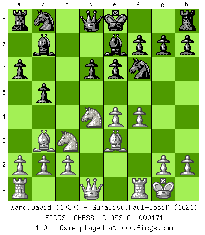Last move : 1-0 2011 March 13 22:28:2 [Event "FICGS__CHESS__CLASS_C__000171"] [Site "FICGS"] [Date "2011.03.09"] [Round "1"] [White "Ward,David"] [Black "Guralivu,Paul-Iosif"] [Result "1-0"] [WhiteElo "1737"] [BlackElo "1621"] 1.e4 c5 2.Nf3 d6 3.d4 cxd4 4.Nxd4 Nf6 5.Nc3 a6 6.Bc4 e6 7.Bb3 b5 8.O-O Be7 9.f4 Bb7 10.Be3 1-0 Sicilian : Najdorf, Lipnitzky attack Kingside Castling by player White (move 8) Player White won this chess game. Follow this game move after move (download)You may learn much more from a game you lose than from a game you win. You will have to lose hundreds of games before becoming a good player. (Jose Raul Capablanca) Verschiedene, sehr schätzbare und im Laufe des Lebens nützliche Eigenschaften des Geistes können durch das Schachspiel erworben und gekräftigt werden, so dass sie zu Gewohnheiten werden, die uns nie im Stich lassen. (Benjamin Franklin) Nos gusta pensar. (Gary Kasparov) On n'a jamais que l'âge auquel on a commence à jouer aux échecs car après on cesse de vieillir. (Capablanca) Nowadays, anyone who cannot speak English and is incapable of using the Internet is regarded as backward. (Al-Waleed bin Talal)