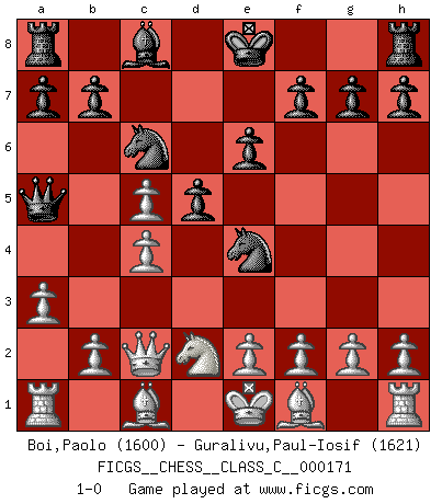 Last move : 1-0 2011 March 13 22:28:12 [Event "FICGS__CHESS__CLASS_C__000171"] [Site "FICGS"] [Date "2011.03.09"] [Round "1"] [White "Boi,Paolo"] [Black "Guralivu,Paul-Iosif"] [Result "1-0"] [WhiteElo "1600"] [BlackElo "1621"] 1.d4 Nf6 2.c4 e6 3.Nc3 Bb4 4.Qc2 d5 5.a3 Bxc3+ 6.Qxc3 Ne4 7.Qc2 c5 8.dxc5 Nc6 9.Nf3 Qa5+ 10.Nd2 1-0 Nimzo-Indian : Classical, Noa variation, Main line, 7.Qc2 Player White won this chess game. Follow this game move after move (download)Many Chess players were surprised when after the game, Fischer quietly explained: 'I had already analyzed this possibility' in a position which I thought was not possible to foresee from the opening. (Mikhail Tal) Der vorletzte Fehler gewinnt. (Savielly Grigorievitsch Tartakower) En la perfecta combinación de Ajedrez como en una historia corta de primera clase, toda la trama y contra trama deberá conducir hacia un final sorprendente, el interes no es mitigado hasta el último momento. (Yates and Winter) Le joueur d'Echecs qui veut atteindre le top est obligé de développer son propre credo créatif. Alexeï Stepanovicth Souétine. Il est facile d'écrire des livres ! Ce qui est difficile, c'est de jouer ! (Alexeï Stepanovicth Souétine) SEO proverb : Make your website optimized for human beings, not for search engines.