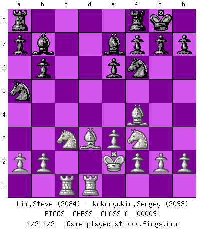 Last move : 1/2-1/2 2011 June 2 9:47:23 [Event "FICGS__CHESS__CLASS_A__000091"] [Site "FICGS"] [Date "2011.03.10"] [Round "1"] [White "Lim,Steve"] [Black "Kokoryukin,Sergey"] [Result "1/2-1/2"] [WhiteElo "2084"] [BlackElo "2093"] 1.d4 Nf6 2.c4 e6 3.Nf3 d5 4.Nc3 Be7 5.Bf4 O-O 6.Rc1 c5 7.dxc5 Nc6 8.e3 Bxc5 9.Be2 dxc4 10.Bxc4 Qxd1+ 11.Kxd1 b6 12.Bb5 Na5 13.Ke2 Bb7 14.Rhd1 Be7 15.Bd3 1/2-1/2 Queen's pawn game Kingside Castling by player Black (move 5) This chess game ended in a draw. Follow this game move after move (download)Bobby Fischer's current state of mind is indeed a tragedy. One of the world's greatest Chess players - the pride and sorrow of American Chess. (Frank Brady) Je älter ich werde, um so mehr schätze ich die Bauern. (Paul Keres) Una buena ofensiva y una buena defensa, comienzan ambas con un buen desarrollo. (Bruce A. Moon) Si je n'étais pas joueur d'échecs, je serais le meilleur dans quelque chose d'autre. (Anatoli Karpov) Art is the only way to run away without leaving home. (Twyla Tharp)