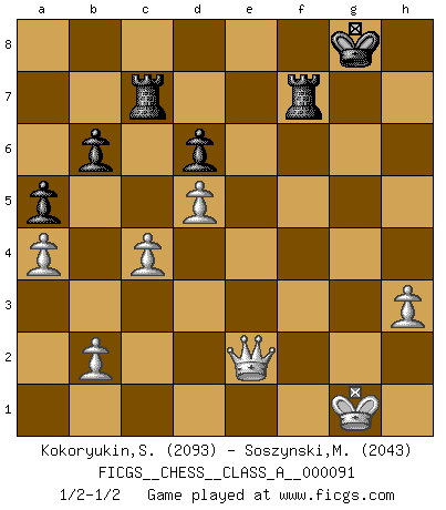 Last move : 1/2-1/2 2011 May 25 12:44:44 [Event "FICGS__CHESS__CLASS_A__000091"] [Site "FICGS"] [Date "2011.03.10"] [Round "1"] [White "Kokoryukin,Sergey"] [Black "Soszynski,Marek"] [Result "1/2-1/2"] [WhiteElo "2093"] [BlackElo "2043"] 1.Nc3 c5 2.e4 g6 3.Nf3 Bg7 4.d4 cxd4 5.Nxd4 Nc6 6.Be3 Nf6 7.Bc4 O-O 8.Bb3 a5 9.O-O Nxd4 10.Bxd4 d6 11.Re1 Bd7 12.a4 Bc6 13.Qd2 Rc8 14.Rad1 Qc7 15.Nd5 Bxd5 16.exd5 Rfe8 17.Re2 Nd7 18.Bxg7 Kxg7 19.Rde1 Nf6 20.h3 b6 21.c3 Qd7 22.f4 h6 23.g4 Kh7 24.Qd3 Rc5 25.Rf1 Rf8 26.g5 hxg5 27.fxg5 Nh5 28.Ref2 f5 29.gxf6 exf6 30.Bd1 Qf7 31.c4 Ng7 32.Rxf6 Qxf6 33.Rxf6 Rxf6 34.Qd4 Rf7 35.Qh4+ Nh5 36.Bxh5 gxh5 37.Qxh5+ Kg8 38.Qe2 R5c7 1/2-1/2 Dunst (Sleipner, Heinrichsen) Opening Kingside Castling by player Black (move 7) Kingside Castling by player White (move 9) This chess game ended in a draw. Follow this game move after move (download)The King is a fighting piece. Use it ! (Wilhelm Steinitz) Kombinieren und Schwarzhandel gehören verboten. (Savielly Grigorievitsch Tartakower) El tablero es el mundo, las piezas es el fenomeno del universo, las reglas del juego son lo que llamamos leyes de la naturaleza y el jugador del lado opuesto, se encuentra oculto a nuestra vista. (Thomas Huxley) Le profane ne songe pas à la somme de jouissance dont il se prive, qui méconnaît ce jeu aux ressources aussi variées que passionnantes. (Jean-Marie Jeanton-Lamarche) The intuitive mind is a sacred gift; the rational mind is a faithful servant. We have created a society that honors the servant but has forgotten the gift. (Albert Einstein)