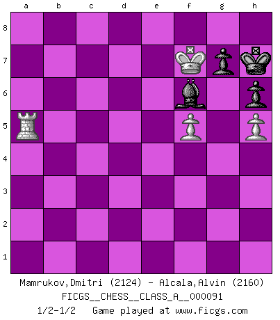 Last move : 1/2-1/2 2011 December 24 20:31:33 [Event "FICGS__CHESS__CLASS_A__000091"] [Site "FICGS"] [Date "2011.03.10"] [Round "1"] [White "Mamrukov,Dmitri"] [Black "Alcala,Alvin"] [Result "1/2-1/2"] [WhiteElo "2124"] [BlackElo "2160"] 1.d4 Nf6 2.c4 c6 3.Nf3 d5 4.Qc2 dxc4 5.Qxc4 Bf5 6.g3 e6 7.Bg2 Nbd7 8.O-O Be7 9.e3 O-O 10.Qe2 c5 11.Rd1 Qc7 12.Nc3 Ne4 13.Ne1 Nxc3 14.bxc3 Rac8 15.e4 Bg6 16.Nd3 cxd4 17.cxd4 Qc4 18.Be3 Qa6 19.a4 Nb6 20.a5 Nc4 21.Ne5 Nxe3 22.Qxe3 Bh5 23.Bf1 Qd6 24.Rdc1 h6 25.h4 Rxc1 26.Rxc1 Bd8 27.Qc3 a6 28.Rb1 f6 29.Nc4 Qc6 30.Qb4 Rf7 31.d5 exd5 32.exd5 Qxd5 33.Nb6 Qf5 34.Bc4 Be7 35.Qb3 Kh8 36.Nd7 Bd6 37.Bxf7 Bxf7 38.Qxb7 Qd3 39.Qc8+ Bg8 40.Rb2 Qd4 41.Qc2 Bxg3 42.Nf8 Bc7 43.Ng6+ Kh7 44.Ne7 Kh8 45.Nxg8 Qg4+ 46.Kf1 Qh3+ 47.Ke2 Qe6+ 48.Kd1 Qd5+ 49.Qd2 Qf3+ 50.Ke1 Kxg8 51.Rb4 Kh8 52.Rc4 Qf5 53.Qc2 Bxa5+ 54.Ke2 Qxc2+ 55.Rxc2 Bb4 56.h5 f5 57.Ke3 Kh7 58.Kf4 a5 59.Kxf5 Be7 60.Ke6 Bf6 61.f4 Bd4 62.Ra2 Bc3 63.Kf7 Bb4 64.Rc2 Be1 65.f5 Bh4 66.Ra2 Bf6 67.Rxa5 1/2-1/2 Queen's pawn game Kingside Castling by player White (move 8) Kingside Castling by player Black (move 9) 10 pieces endgame at move 55 : White KRPP , Black KBPPPP WHITE : King + 1 Rook 2 Pawns BLACK : King + 1 Bishop 4 Pawns 9 pieces endgame at move 59 : White KRPP , Black KBPPP WHITE : King + 1 Rook 2 Pawns BLACK : King + 1 Bishop 3 Pawns 8 pieces endgame at move 67 : White KRPP , Black KBPP WHITE : King + 1 Rook 2 Pawns BLACK : King + 1 Bishop 2 Pawns This chess game ended in a draw. Follow this game move after move (download)Kasparov : J'adoube , Ivanchuk : S'il vous plaît ! (Garry Kasparov & Vassily Ivanchuk, Linares 1997) Die meiste Zeit treffe ich auf Gegner, die meine Enkel sein könnten. Ich bin da, um ihnen zu zeigen, dass sie von mir noch einiges lernen können. (Viktor Kortschnoi) Un mal plan es mejor que no tener ningún plan. (Frank Marshall) Le temps de noter son nom sur la feuille de partie, j'étais déjà en zeitnot ! D'un modeste amateur apparié lors de la première ronde d'un open contre le grand-maître Azmaïparashvili. If you have any trouble condescending, find a Unix user to show you how it's done. (Scott Adams)
