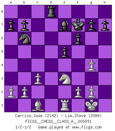 Last move : 1/2-1/2 2011 June 25 2:34:45 [Event "FICGS__CHESS__CLASS_A__000091"] [Site "FICGS"] [Date "2011.03.10"] [Round "1"] [White "Carrizo,Jose"] [Black "Lim,Steve"] [Result "1/2-1/2"] [WhiteElo "2142"] [BlackElo "2084"] 1.e4 c5 2.c3 Nf6 3.e5 Nd5 4.d4 cxd4 5.Nf3 Nc6 6.Bc4 Nb6 7.Bb3 d5 8.exd6 Qxd6 9.O-O Be6 10.Bxe6 Qxe6 11.Nxd4 Nxd4 12.Qxd4 Rd8 13.Qh4 Qe2 14.Nd2 e5 15.Ne4 Rd1 16.Ng3 Rxf1+ 17.Nxf1 Be7 18.Qg3 O-O 19.Bd2 f6 20.Re1 Qa6 21.Ne3 Qd3 22.Bc1 Qe4 23.h3 Rd8 24.Qg4 Qxg4 25.hxg4 Kf7 1/2-1/2 Sicilian : Alapin's variation (2.c3) Kingside Castling by player White (move 9) Kingside Castling by player Black (move 18) This chess game ended in a draw. Follow this game move after move (download)The battle for the ultimate truth will never be won. And that's why Chess is so fascinating. (Hans Kmoch) Rauchen ist dem Schachspieler bei seiner Arbeit, also im Wettkampf, untersagt. (Viktor Kortschnoi) No todos los artistas son jugadores de Ajedrez, pero todos los jugadores de Ajedrez son artistas. (Marcel Duchamp) Si rien de grave n'est détecté lors de l'analyse d'une position, on joue alors le coup. Seconde règle de Blumenfeld. If you work for a living, why do you kill yourself working ? (Tuco to a chicken in The Good, The Bad and The Ugly)