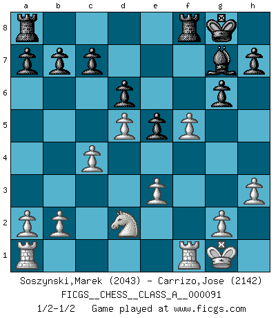 Last move : 1/2-1/2 2011 May 10 16:45:47 [Event "FICGS__CHESS__CLASS_A__000091"] [Site "FICGS"] [Date "2011.03.10"] [Round "1"] [White "Soszynski,Marek"] [Black "Carrizo,Jose"] [Result "1/2-1/2"] [WhiteElo "2043"] [BlackElo "2142"] 1.d4 d6 2.Nf3 g6 3.c4 Bg7 4.e4 Bg4 5.Be2 Nc6 6.Be3 e5 7.d5 Bxf3 8.Bxf3 Nd4 9.Nd2 Nf6 10.O-O O-O 11.Nb3 Nxf3+ 12.Qxf3 Qd7 13.Nd2 Qg4 14.Qxg4 Nxg4 15.h3 Nxe3 16.fxe3 f5 17.exf5 1/2-1/2 Queen's Pawn Kingside Castling by player White (move 10) Kingside Castling by player Black (move 10) This chess game ended in a draw. Follow this game move after move (download)For me, Chess is life and every game is like a new life. Every Chess player gets to live many lives in one lifetime. (Eduard Gufeld) Das Schachspiel ist ein See, in welchem eine Mücke baden und ein Elefant ertrinken kann. (Emanuel Lasker) Observen a Garry Kasparov. Después de una derrota, invariablemente el gana la próxima partida. Prácticamente hace pedazos a su siguiente oponente. Eso es algo que tenemos que aprender a lograr. (Maurice Ashley) Le plus grand jeu de l'esprit jamais inventé, plus vous l'apprenez, plus vous y prenez du plaisir. (Garry Kasparov) At work, the authority of a person is inversely proportional to the number of pens that person is carrying. (Dan Rotaru)