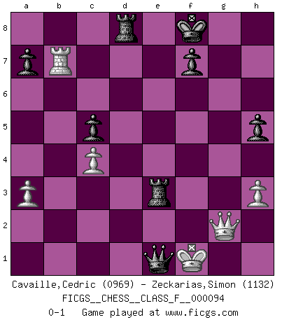 Last move : 0-1 2011 April 5 17:39:33 [Event "FICGS__CHESS__CLASS_F__000094"] [Site "FICGS"] [Date "2011.03.10"] [Round "1"] [White "Cavaille,Cedric"] [Black "Zeckarias,Simon"] [Result "0-1"] [WhiteElo "0969"] [BlackElo "1132"] 1.e4 e5 2.Nf3 Nc6 3.Bc4 Nf6 4.Nc3 Bc5 5.d4 exd4 6.Nd5 Nxe4 7.O-O h5 8.Bf4 d6 9.Re1 Bf5 10.a3 d3 11.b4 Bxf2+ 12.Kf1 Bxe1 13.Nxe1 d2 14.Nf3 O-O 15.Nxd2 Nxd2+ 16.Qxd2 Ne7 17.Nxe7+ Qxe7 18.Bd3 Bxd3+ 19.Qxd3 g5 20.Be3 c5 21.bxc5 dxc5 22.c4 Rad8 23.Qe2 Rfe8 24.Re1 g4 25.h3 gxh3 26.gxh3 Qh4 27.Qg2+ Kf8 28.Rb1 Rxe3 29.Rxb7 Qe1+ 0-1 Two knights defense Kingside Castling by player White (move 7) Kingside Castling by player Black (move 14) Player Black won this chess game. Follow this game move after move (download)The essence of Chess is thinking about what Chess is. (David Bronstein) Obendrein hat der FIDE-Präsident den Revolutionsführer Gaddafi zum »Großmeister« ernannt, am Ende der WM. Das ist lächerlich! (Joel Lautier) La partida mas dura de ganar es una partida ganada. (Emanuel Lasker) Avant la finale, les dieux ont créé le milieu de partie. (Tarrasch) The worth of a book is to be measured by what you can carry away from it. (James Bryce)