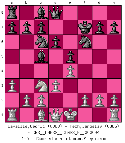 Last move : 1-0 2011 May 24 6:46:45 [Event "FICGS__CHESS__CLASS_F__000094"] [Site "FICGS"] [Date "2011.03.10"] [Round "1"] [White "Cavaille,Cedric"] [Black "Pech,Jaroslav"] [Result "1-0"] [WhiteElo "0969"] [BlackElo "0865"] 1.e4 Nf6 2.Nc3 e5 3.Nf3 Nc6 4.Bc4 Bc5 5.d3 d6 6.Ng5 O-O 7.Bxf7+ Rxf7 8.Nxf7 Kxf7 9.a3 1-0 This chess game has been lost on time (started : 2011.03.10 14:11:9) Alekhine's defense Kingside Castling by player Black (move 6) Player White won this chess game. Follow this game move after move (download)Chess problems demand from the composer the same virtues that characterize all worthwhile art: originality, invention, conciseness, harmony, complexity, and splendid insincerity. (Vladimir Nabokov) Zu meiner Zeit war ein 20 jähriger ein junger Spieler, heute ist er ein Veteran. (Garry Kasparov) Mi estilo es algo parecido entre un poco de Tal y Petrosian. (Reshevsky) Ne tendez aucun piège pour le plaisir ! Ne jouez rien dans l'espoir que l'adversaire réagisse de façon stupide ! Prenez toujours pour acquis que l'adversaire va trouver le meilleur coup ! Ne jouez jamais de coup dans l'espoir que l'adversaire ne voie pas la menace ! Chacun de vos coups doit améliorer la position d'une façon ou d'une autre. Somewhere in the world there is an epigram for every dilemma. (Hendrik Willem van Loon)