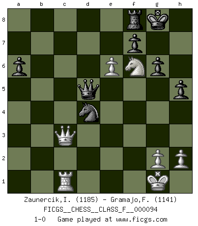 Last move : 1-0 2011 May 3 20:19:44 [Event "FICGS__CHESS__CLASS_F__000094"] [Site "FICGS"] [Date "2011.03.10"] [Round "1"] [White "Zaunercik,Ilmar"] [Black "Gramajo,Francisco"] [Result "1-0"] [WhiteElo "1185"] [BlackElo "1141"] 1.e4 e5 2.Nf3 Qf6 3.d4 exd4 4.Nxd4 Bc5 5.Be3 Nc6 6.c3 Ne5 7.Be2 a6 8.O-O h6 9.f4 Nc6 10.e5 Qd8 11.Nd2 Nxd4 12.Bxd4 Bxd4+ 13.cxd4 Ne7 14.f5 d5 15.Bh5 Bxf5 16.Nb3 b6 17.Qf3 g6 18.Bg4 h5 19.Bxf5 Nxf5 20.Rac1 O-O 21.Rf2 c5 22.dxc5 Rc8 23.Rd2 bxc5 24.Rxd5 Qb6 25.Rdxc5 Rxc5 26.Nxc5 Qxb2 27.Qc3 Qxa2 28.e6 Qd5 29.Nd7 Nd4 30.Nf6+ 1-0 Greco defense Kingside Castling by player White (move 8) Kingside Castling by player Black (move 20) Player White won this chess game. Follow this game move after move (download)Chess is a terrific way for kids to build self image and self esteem. (Saudin Robovic) Der vorletzte Fehler gewinnt. (Savielly Grigorievitsch Tartakower) Haz el enroque temprano y seguido. (Rob Sillars) Ce qui est bien, c'est d'avoir tout un tas de pièces en prise : l'adversaire ne peut en prendre qu'une à la fois. Cité par Thierry Audin. Computers make it easier to do a lot of things, but most of the things they make it easier to do don't need to be done. (Andy Rooney)