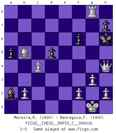 Last move : 1-0 2007 February 23 14:37:3 [Event "FICGS__CHESS__RAPID_C__000016"] [Site "FICGS"] [Date "2006.12.14"] [Round "1"] [White "Moreira,Renato"] [Black "Benreguia,Frederic"] [Result "1-0"] [WhiteElo "1400"] [BlackElo "1400"] 1.e4 d5 2.exd5 Qxd5 3.Nc3 Qe5+ 4.Be2 e6 5.Nf3 Qf4 6.d4 Qg4 7.O-O Bd6 8.Ne5 Qf5 9.Bd3 Qf6 10.Ne4 Qd8 11.Nc4 Nc6 12.Be3 Qh4 13.g3 Qe7 14.c3 Nf6 15.Qf3 a5 16.Bg5 e5 17.Bxf6 gxf6 18.Nxf6+ Kd8 19.Rfe1 b6 20.Rad1 b5 21.Nxe5 Nxe5 22.dxe5 Bc5 23.Bxb5 Bd6 24.exd6 cxd6 25.Rxe7 Kxe7 26.Re1+ Kf8 27.Qxa8 Kg7 28.Ne8+ Rxe8 29.Rxe8 Be6 30.Qf3 Bxa2 31.c4 f6 32.Qg4+ Kh6 33.Rg8 d5 34.Qh4+ 1-0 Scandinavian (centre counter) defense Kingside Castling by player White (move 7) Player White won this chess game. Follow this game move after move (download)Chess is everything: art, science and sport. (Anatoly Karpov) Ein Springer auf f6 gegen die eigene Rochadestellung ist schlimmer als ein rostiger Nagel im Knie. (Efim Bogoljubov) Fischer sacrificó virtualmente todo lo que la mayoría de nosotros los 'debiles' (término que él usa) valoramos, respetamos y apreciamos por el amor de un astuto, a menudo hermoso tablero de juego, por el privilegio ambivalente de ser su mas grande maestro. (Paul Kollar) Les échecs, c'est l'imagination. (David Bronstein) If we knew what we were doing, we would not call it research. (Albert Einstein)