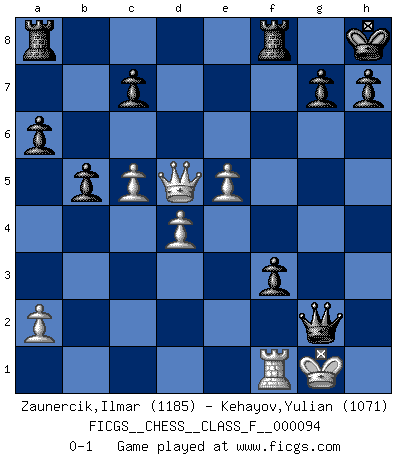 Last move : 0-1 2011 May 18 7:47:22 [Event "FICGS__CHESS__CLASS_F__000094"] [Site "FICGS"] [Date "2011.03.10"] [Round "1"] [White "Zaunercik,Ilmar"] [Black "Kehayov,Yulian"] [Result "0-1"] [WhiteElo "1185"] [BlackElo "1071"] 1.e4 e5 2.Nf3 Nc6 3.Bb5 Nf6 4.O-O Bc5 5.c3 Be7 6.Re1 O-O 7.d4 exd4 8.cxd4 a6 9.Ba4 d5 10.e5 Nd7 11.Bb3 Nb6 12.Nc3 Bg4 13.Be3 Nc4 14.Bxc4 dxc4 15.Ne4 f5 16.Nc3 f4 17.Bc1 Nb4 18.h3 Bxf3 19.Qxf3 Nc2 20.Nd5 Nxe1 21.Qe4 Nd3 22.Nxe7+ Qxe7 23.Bd2 b5 24.b3 Qa3 25.Qd5+ Kh8 26.bxc4 Qb2 27.Rd1 Qc2 28.Rf1 Qxd2 29.c5 f3 30.g3 Nxf2 31.Rxf2 Qe1+ 32.Rf1 Qxg3+ 33.Kh1 Qxh3+ 34.Kg1 Qg2+ 0-1 Ruy Lopez : Berlin defense, Beverwijk variation Kingside Castling by player White (move 4) Kingside Castling by player Black (move 6) Player Black won this chess game. Follow this game move after move (download)Fischer is completely natural. He plays no roles. He's like a child. Very, very simple. (Zita Rajcsanyi) Als ich elf wurde, wurde ich einfach gut. (Robert James Fischer) Fischer es una tragedia del Ajedrez Americano a la par con Morphy y Pillsbury. (Mig Greengard) Les échecs, c'est l'art d'analyser. (Mikhail Botvinnik) As a goal marker shodan is important. As a destination it is a poor place to stop. (Thomas Tamayo)