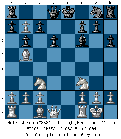 Last move : 1-0 2011 March 29 22:10:46 [Event "FICGS__CHESS__CLASS_F__000094"] [Site "FICGS"] [Date "2011.03.10"] [Round "1"] [White "Holdt,Jonas"] [Black "Gramajo,Francisco"] [Result "1-0"] [WhiteElo "0862"] [BlackElo "1141"] 1.d4 Nc6 2.Nf3 b6 3.Nc3 Bb7 4.e4 d6 5.Bb5 e6 6.O-O h6 7.d5 exd5 8.exd5 Be7 9.dxc6 Bf6 10.cxb7 1-0 Queen's pawn : Lundin (Kevitz-Mikenas) defense Kingside Castling by player White (move 6) Player White won this chess game. Follow this game move after move (download)Chess is 99 percent tactics. (Teichmann) Dieses schreckliche Gefühl, dass ich gegen eine Maschine spielte, die niemals Fehler macht, zerschmetterte meinen Widerstand. (Mark Taimanov) Evita las multitudes. Haz independientemente tu propio razonamiento. Trata de ser el jugador de Ajedrez, no la pieza de Ajedrez. (Ralph Charell) Je menace de comprendre la position. (Anonyme) You have to believe in yourself. (Sun Tzu)